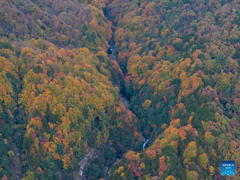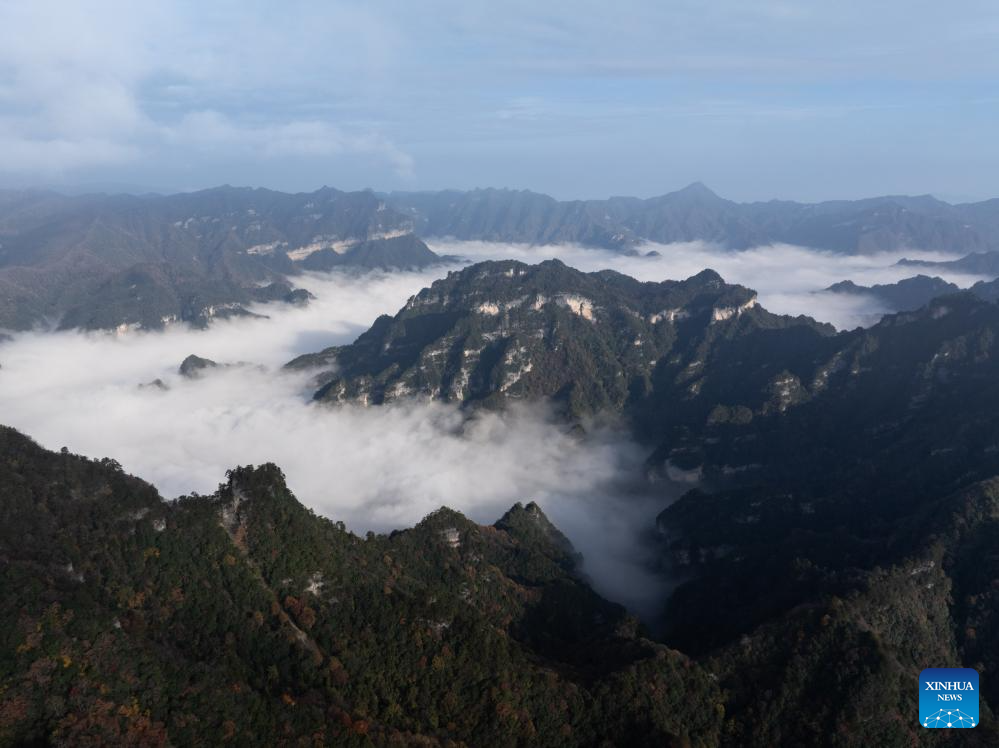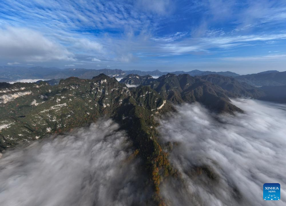 An aerial drone photo taken on Nov. 6, 2024 shows the scenery in Guangwu Mountain scenic area in Bazhong City, southwest China's Sichuan Province. (Xinhua/Jiang Hongjing)