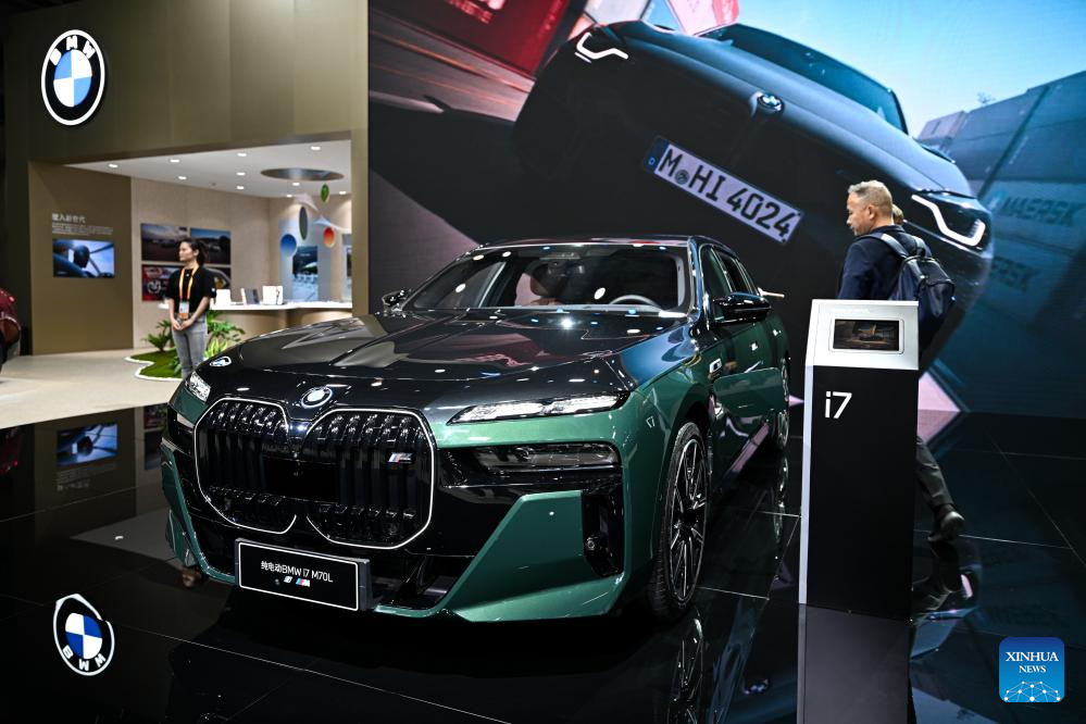 A BMW i7 electric luxury sedan is on display at the Automobile Exhibition Area during the seventh China International Import Expo (CIIE) in east China's Shanghai, Nov. 7, 2024. The Automobile Exhibition Area, with the theme of "Unlimited Mobility Possibilities in the Future," serves as a platform for showcasing high-end technology and debuting new automotive products. (Xinhua/Xin Yuewei)