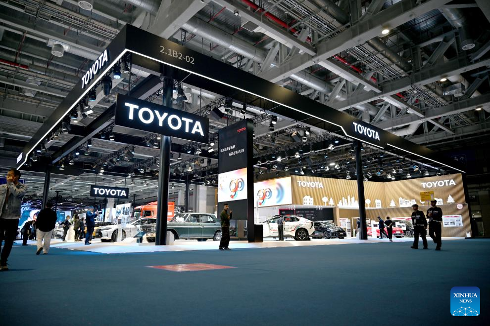 People visit the booth of Toyota at the Automobile Exhibition Area during the seventh China International Import Expo (CIIE) in east China's Shanghai, Nov. 5, 2024. The Automobile Exhibition Area, with the theme of "Unlimited Mobility Possibilities in the Future," serves as a platform for showcasing high-end technology and debuting new automotive products. (Photo by Chen Haoming/Xinhua)
