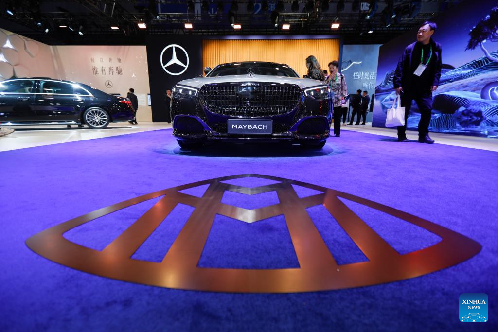 A Mercedes-Maybach S680 sedan is on display at the Automobile Exhibition Area during the seventh China International Import Expo (CIIE) in east China's Shanghai, Nov. 7, 2024. The Automobile Exhibition Area, with the theme of "Unlimited Mobility Possibilities in the Future," serves as a platform for showcasing high-end technology and debuting new automotive products. (Photo by Chang Nengjia/Xinhua)