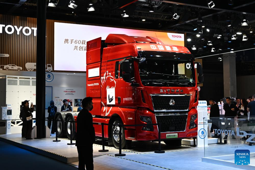 A hydrogen fuel cell heavy truck is on display at the Automobile Exhibition Area during the seventh China International Import Expo (CIIE) in east China's Shanghai, Nov. 7, 2024. The Automobile Exhibition Area, with the theme of "Unlimited Mobility Possibilities in the Future," serves as a platform for showcasing high-end technology and debuting new automotive products. (Xinhua/Xin Yuewei)