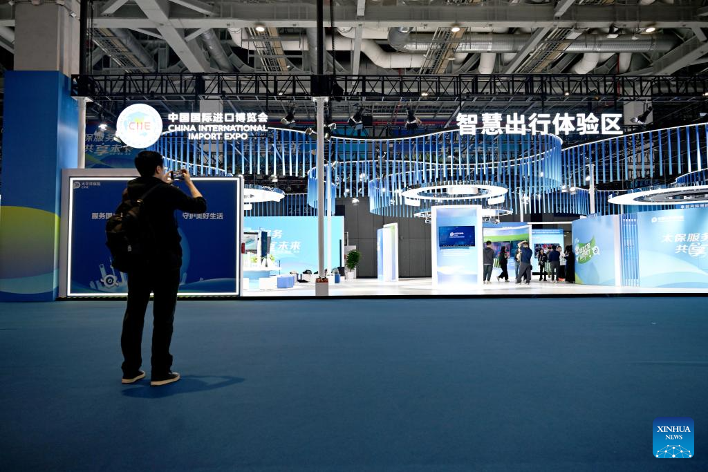 A visitor takes photos outside the smart travel experience section at the Automobile Exhibition Area during the seventh China International Import Expo (CIIE) in east China's Shanghai, Nov. 5, 2024. The Automobile Exhibition Area, with the theme of "Unlimited Mobility Possibilities in the Future," serves as a platform for showcasing high-end technology and debuting new automotive products. (Photo by Chen Haoming/Xinhua)