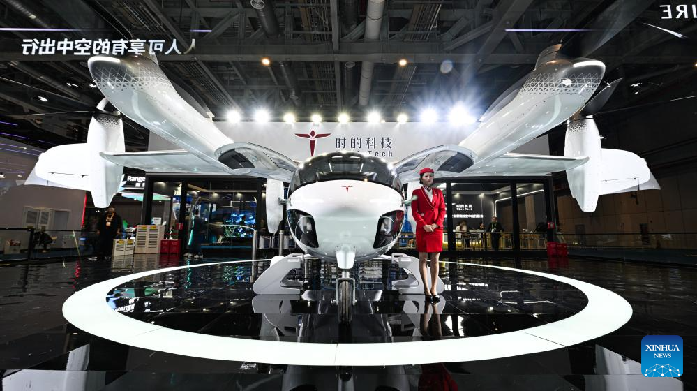 An electric vertical takeoff and landing aircraft is on display at the booth of TCab Tech at the Automobile Exhibition Area during the seventh China International Import Expo (CIIE) in east China's Shanghai, Nov. 7, 2024. The Automobile Exhibition Area, with the theme of "Unlimited Mobility Possibilities in the Future," serves as a platform for showcasing high-end technology and debuting new automotive products. (Xinhua/Xin Yuewei)