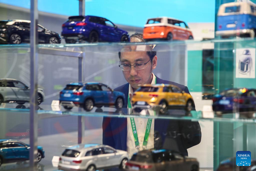 A visitor looks at car models of Volkswagen at the Automobile Exhibition Area during the seventh China International Import Expo (CIIE) in east China's Shanghai, Nov. 7, 2024. The Automobile Exhibition Area, with the theme of "Unlimited Mobility Possibilities in the Future," serves as a platform for showcasing high-end technology and debuting new automotive products. (Photo by Chang Nengjia/Xinhua)