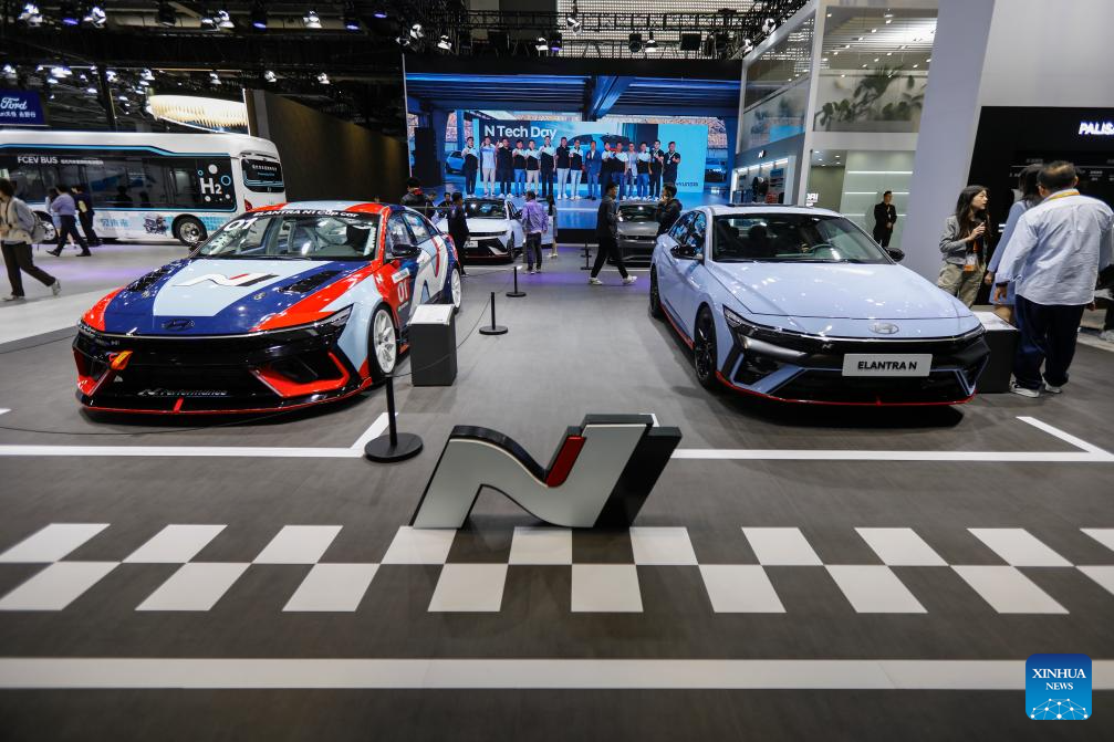 New Hyundai Elantra vehicles are on display at the Automobile Exhibition Area during the seventh China International Import Expo (CIIE) in east China's Shanghai, Nov. 7, 2024. The Automobile Exhibition Area, with the theme of "Unlimited Mobility Possibilities in the Future," serves as a platform for showcasing high-end technology and debuting new automotive products. (Photo by Chang Nengjia/Xinhua)
