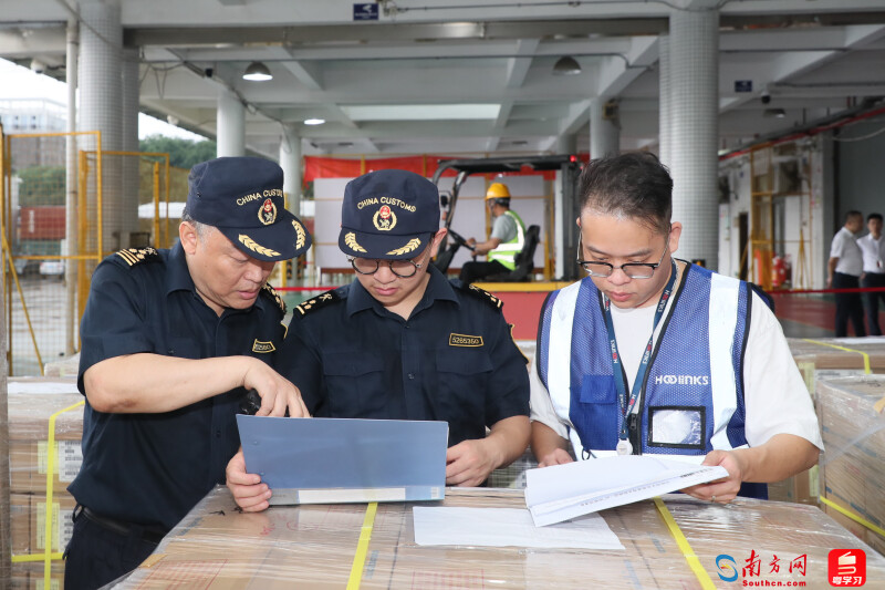 Staff? members of Luogang Customs check the goods. (southcn.com/Li Jianfeng)