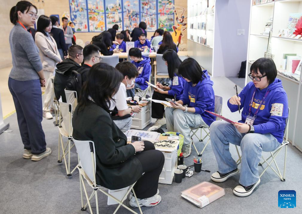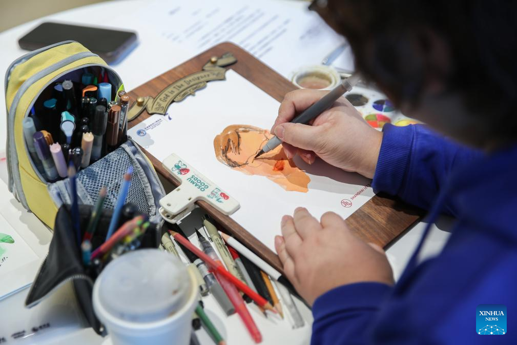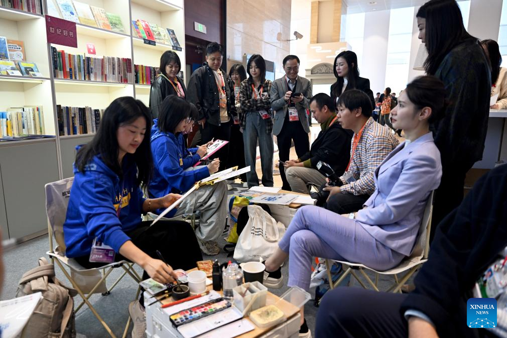 Staff members draw portraits for media professionals at the 7th China International Import Expo (CIIE) in Shanghai, east China, Nov. 8, 2024.