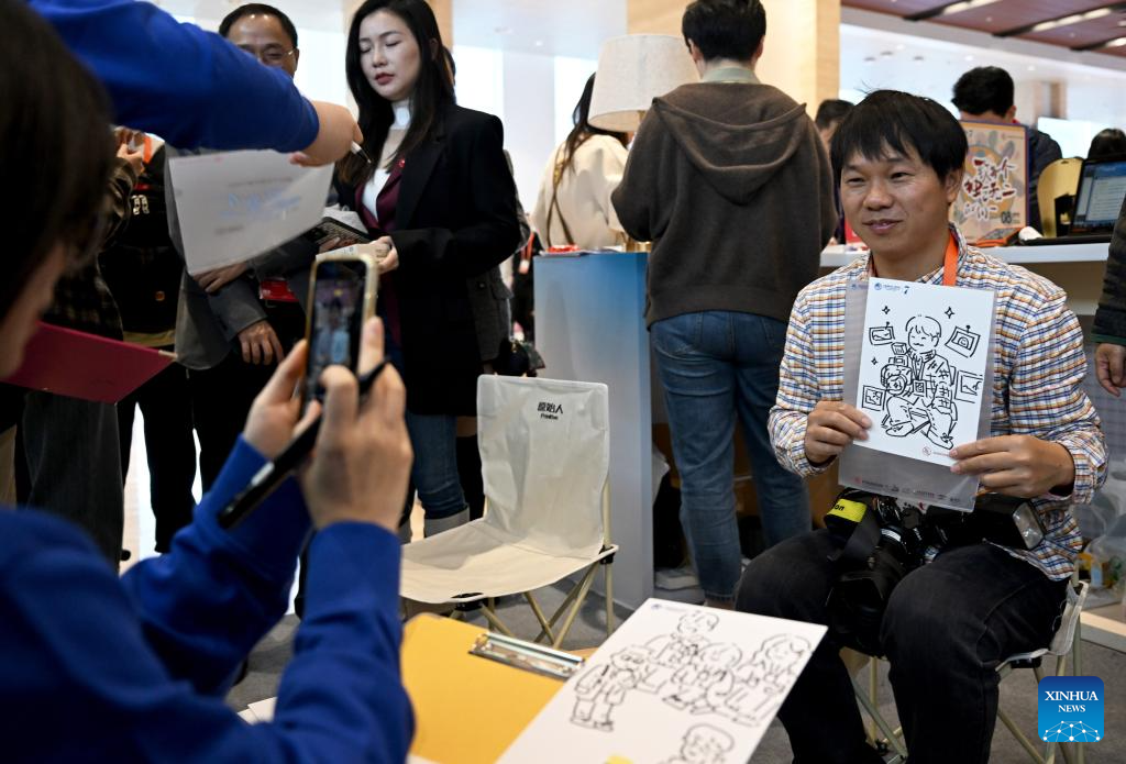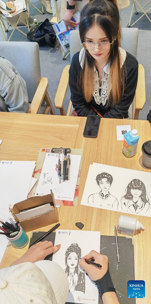 This photo taken with a mobile phone shows a staff member drawing the portrait of a journalist at the 7th China International Import Expo (CIIE) in Shanghai, east China, Nov. 8, 2024.