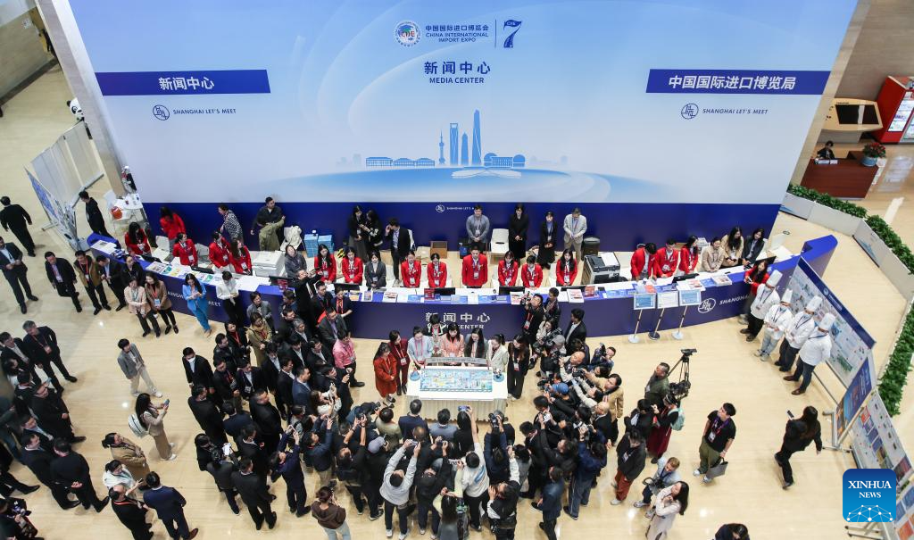 The media center for the 7th CIIE held various events on Friday to mark China's annual Journalists' Day, which falls on Nov. 8. (Xinhua/Yin Gang)