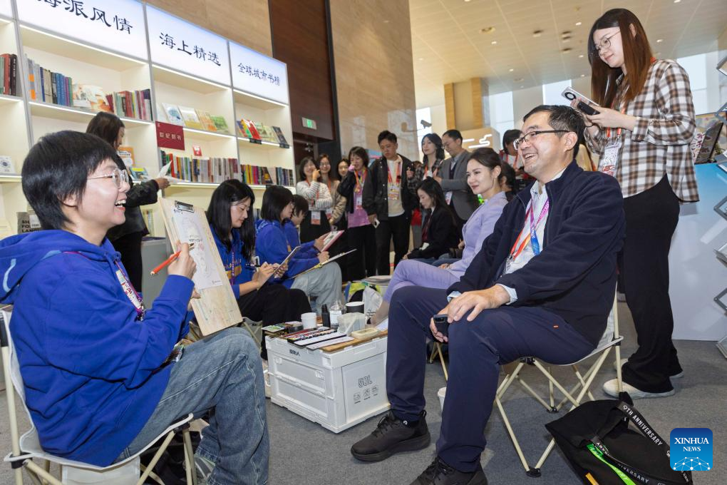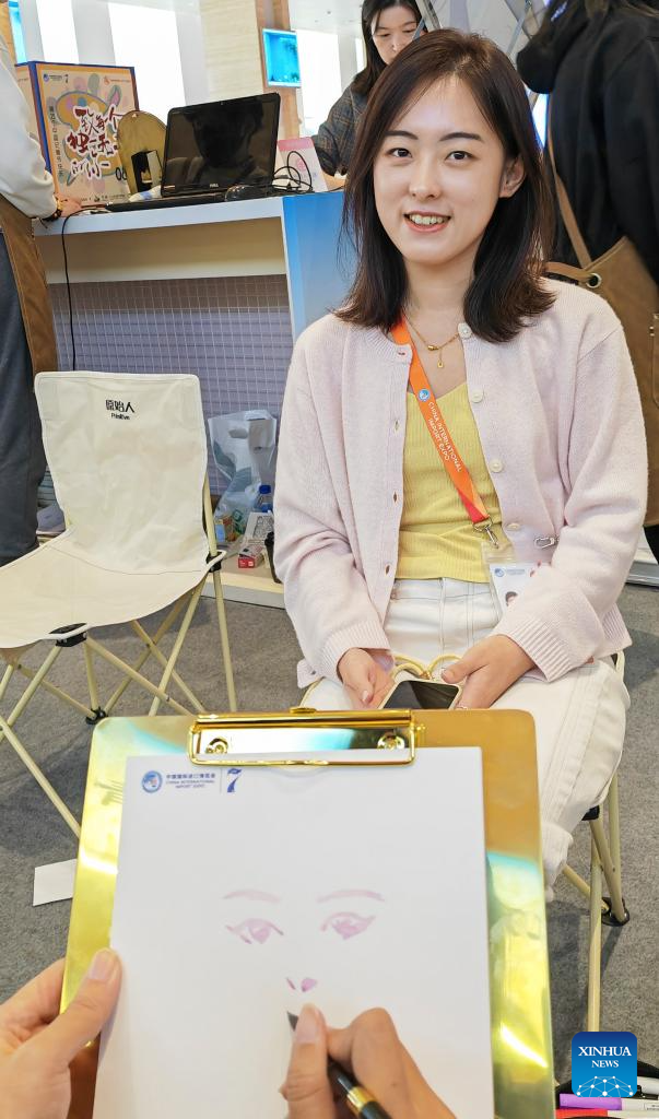 A staff member draws a portrait for a journalist at the 7th China International Import Expo (CIIE) in Shanghai, east China, Nov. 8, 2024.