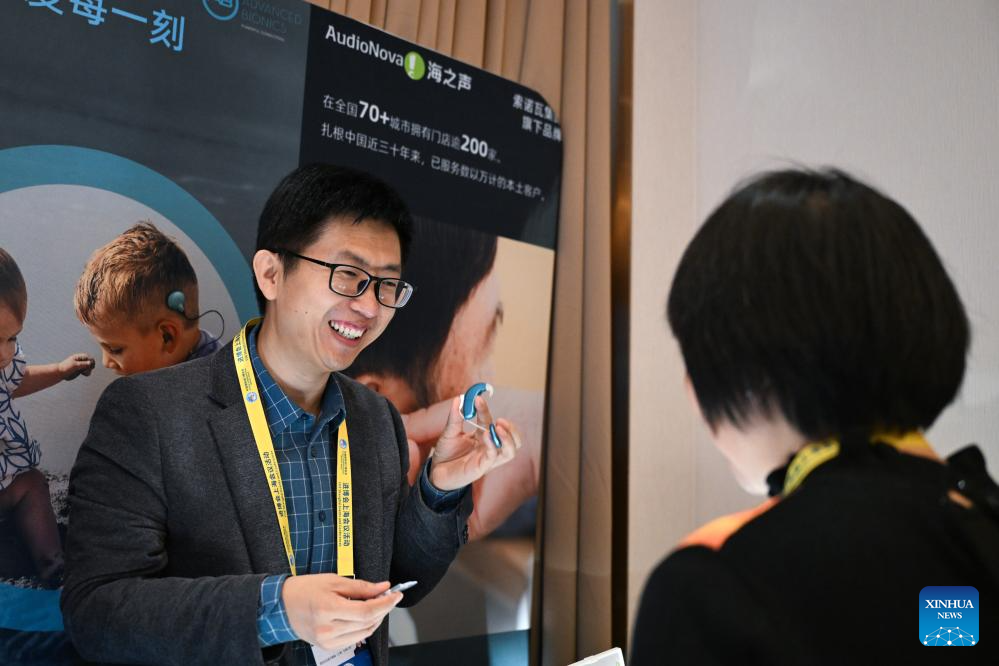 A staff member of Swiss hearing aid provider Sonova Holding AG demonstrates a cochlear implant at the China International Import Expo (CIIE) Shanghai Events and Conferences in east China's Shanghai, Nov. 8, 2024.