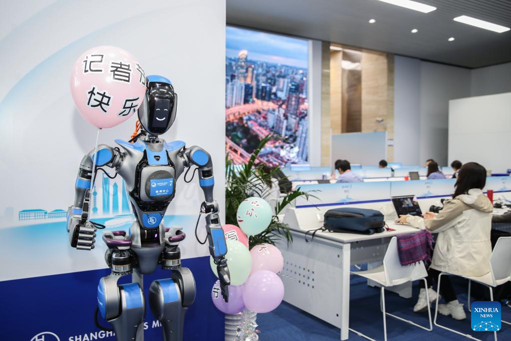 Xiaoxin, a humanoid robot providing inquiry service, holds a balloon bearing the message of "Happy Journalists' Day" at the media center for the 7th China International Import Expo (CIIE) in Shanghai, east China, Nov. 8, 2024.