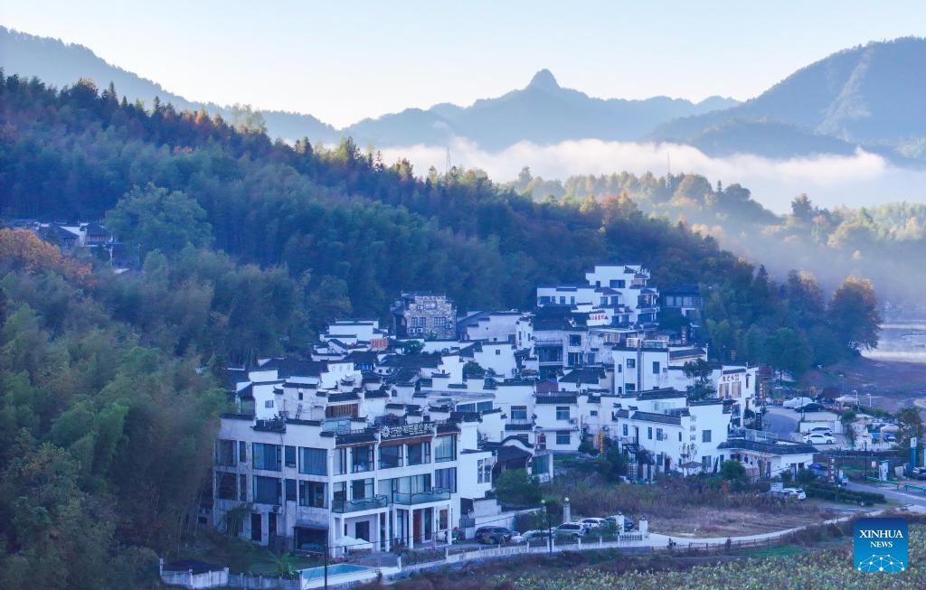 An aerial drone photo shows a view of a building complex for hospitality services near Tachuan Village, Yixian County, Huangshan City, east China's Anhui Province, Nov. 8, 2024. (Xinhua/Chen Yehua)