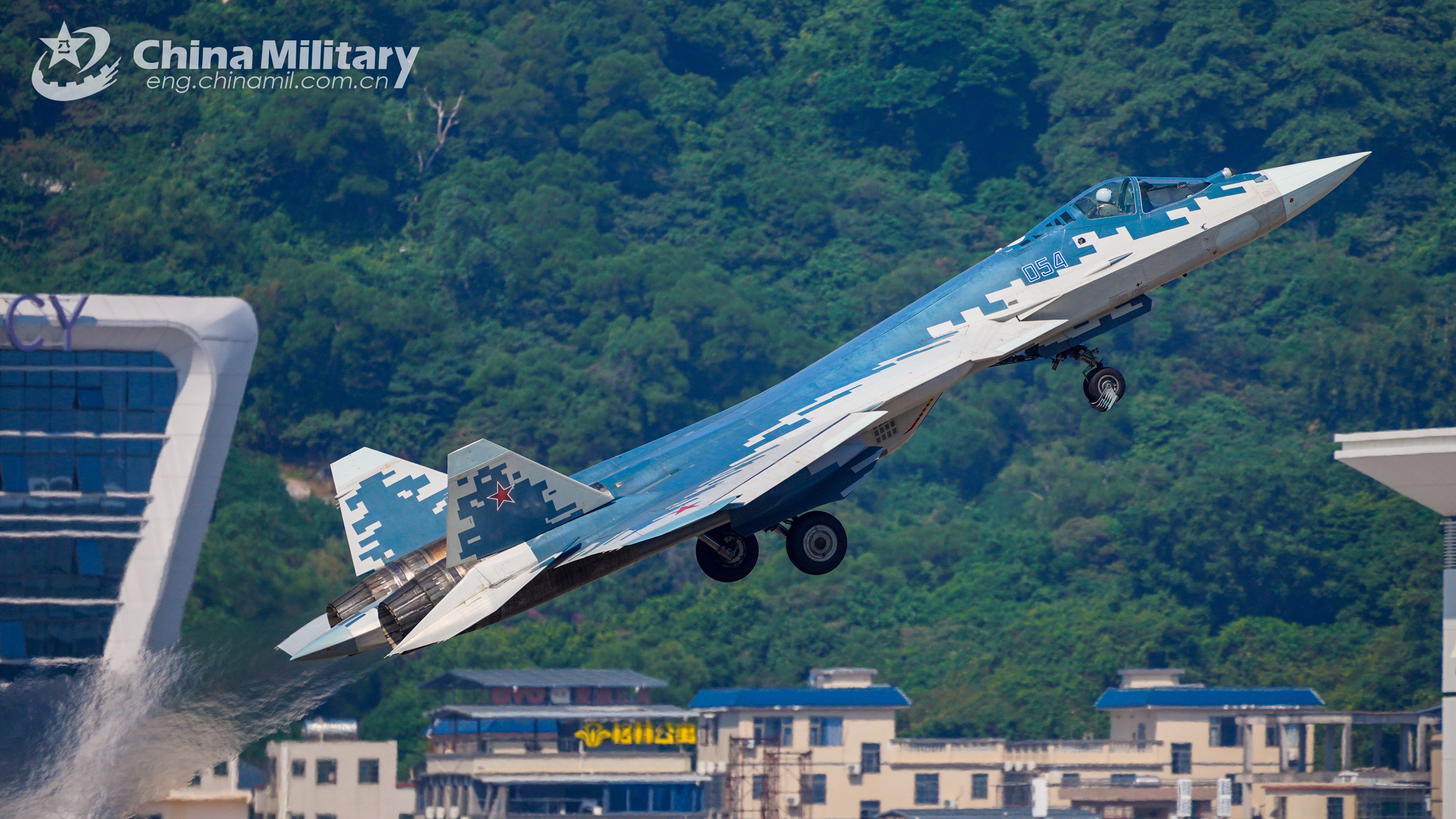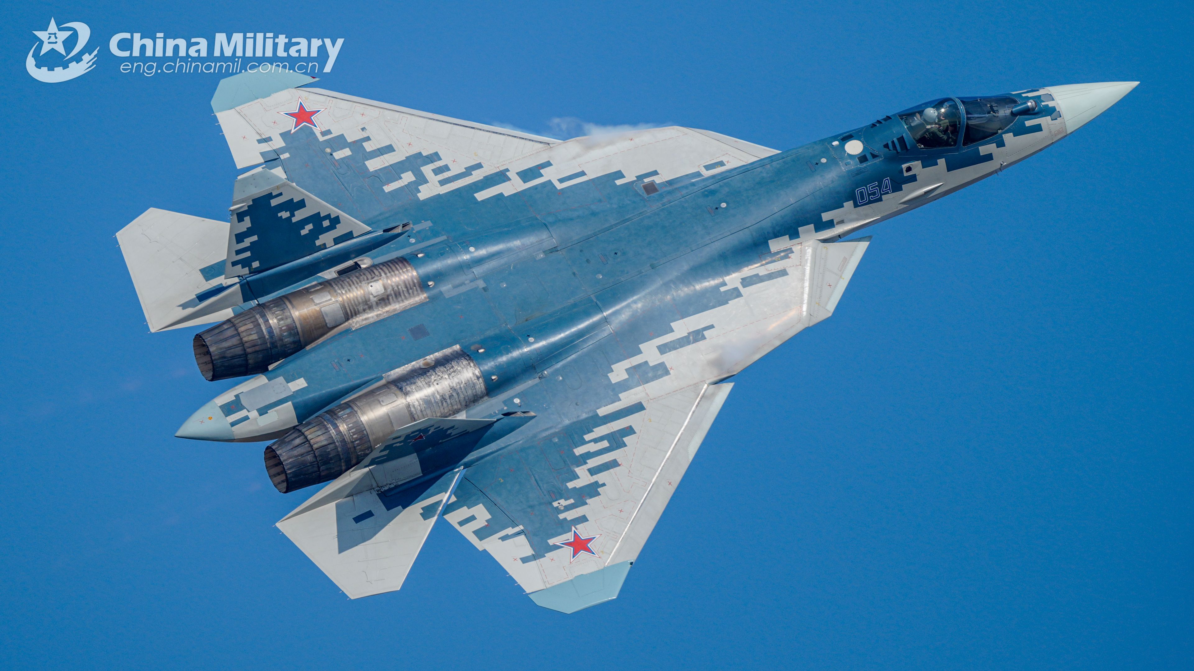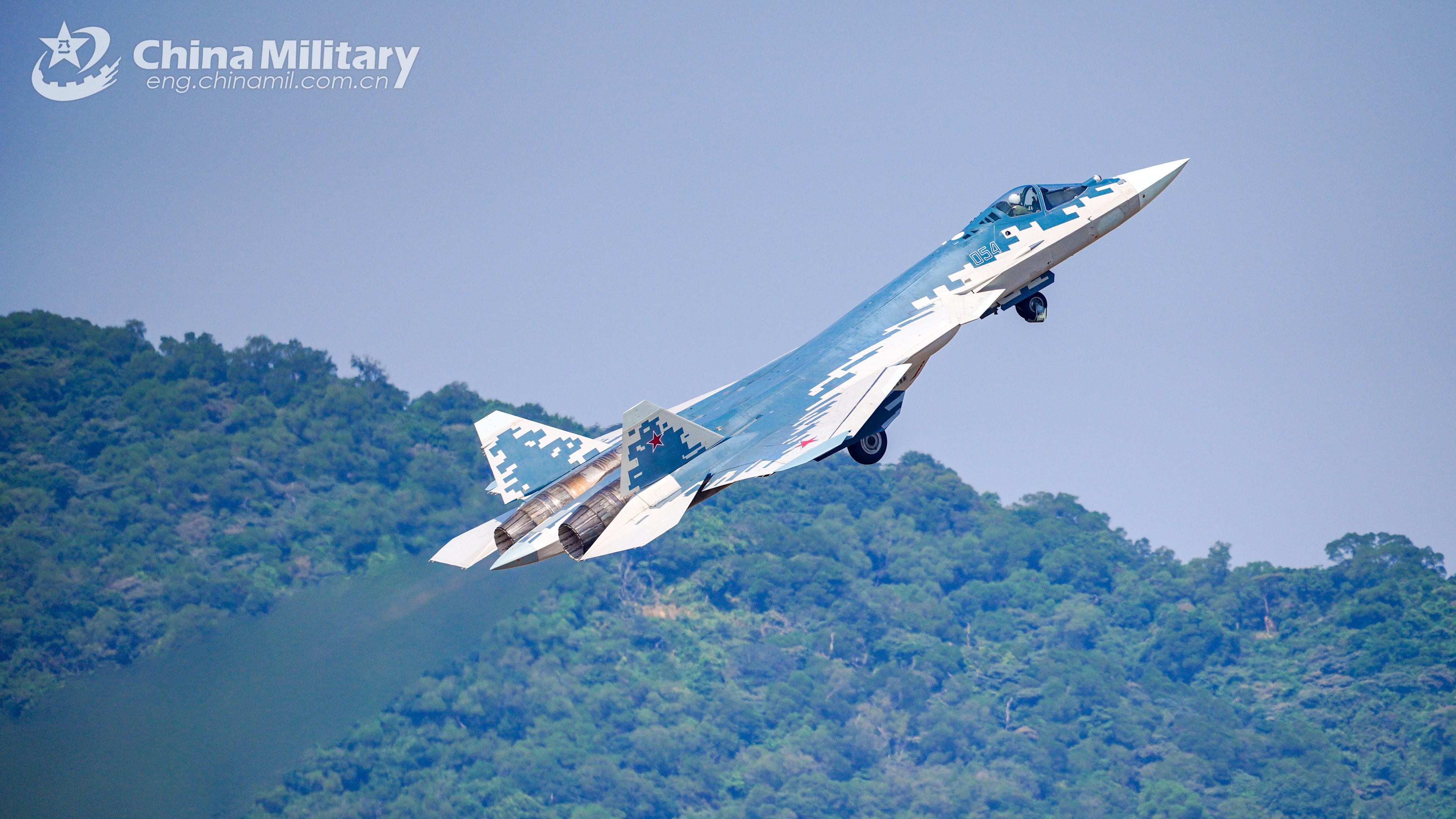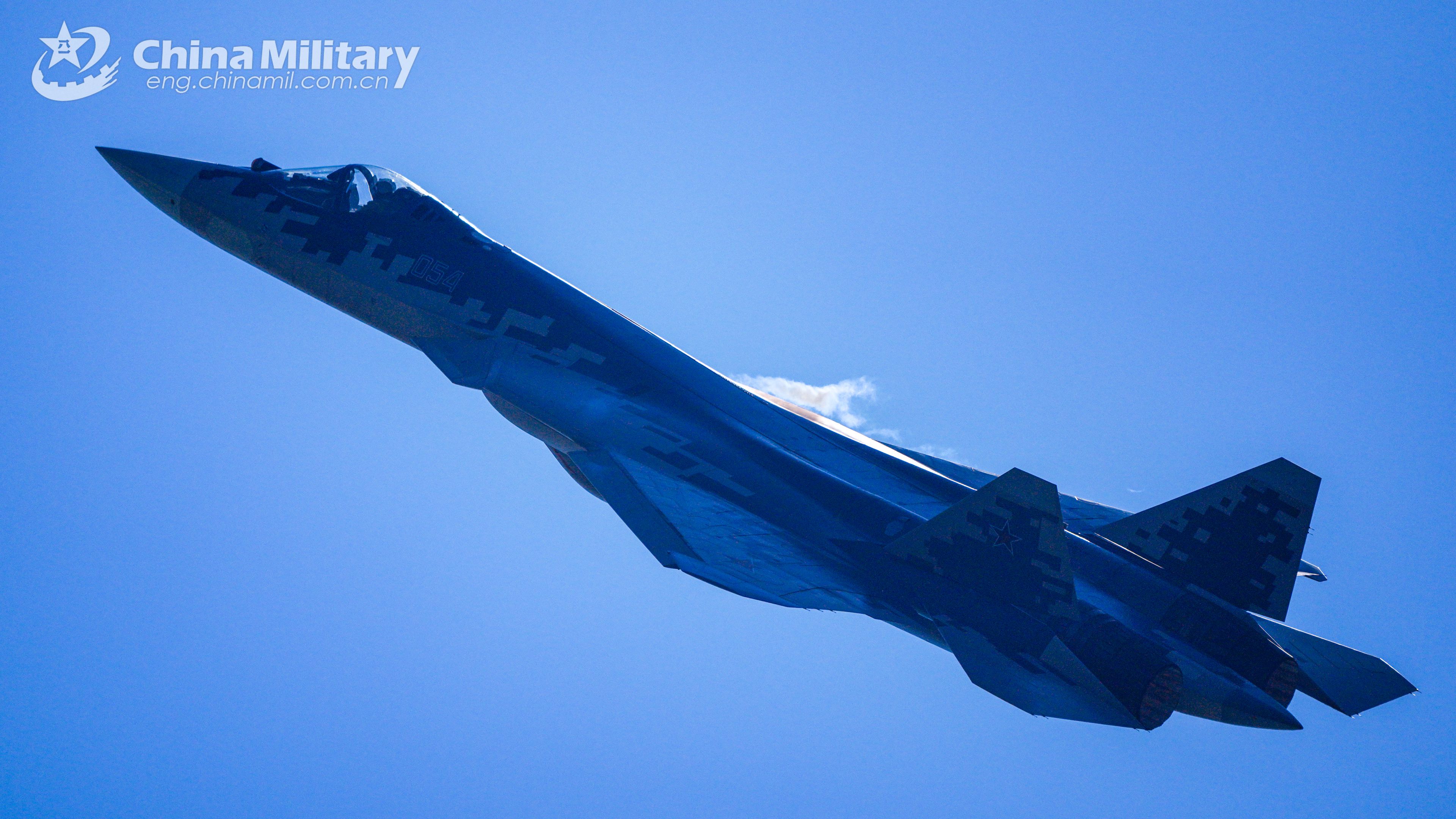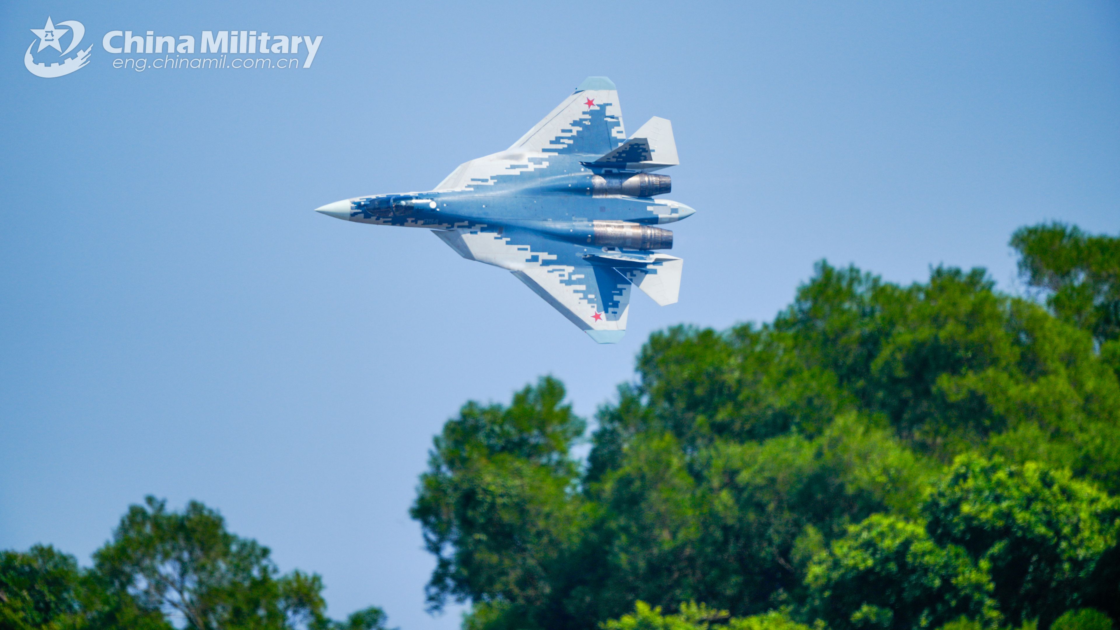 A Russian Su-57 stealth fighter jet performs "Falling Leaf Maneuver" during its first adaptive training at noon on November 7 in Zhuhai City, south China's Guangdong Province, in preparation for the upcoming Airshow China 2024, which is scheduled to be held from November 12 to 17. (eng.chinamil.com.cn/Photo by Wan Quan)