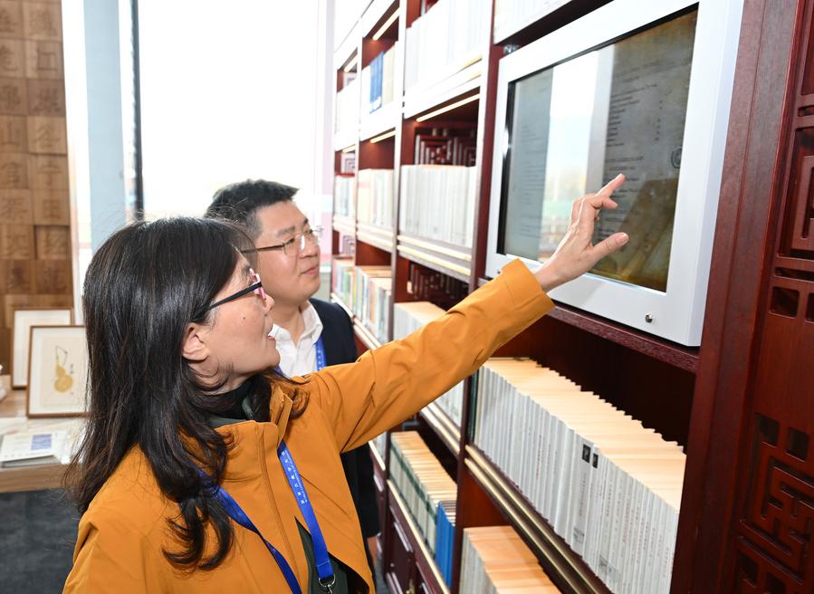 A staff member shows an interactive screen with classic books during an exhibition on classical studies achievements in Beijing, capital of China, on Nov. 7, 2024. (Xinhua/Li He)