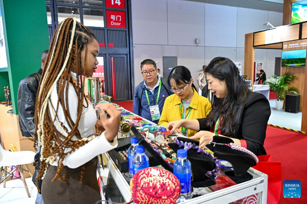 Visitors look at exhibits at the Togo Pavilion during the seventh China International Import Expo (CIIE) in east China's Shanghai, Nov. 7, 2024. The current edition of CIIE has further expanded the exhibition scale for African countries and brands at the Country Exhibition area and the Food and Agricultural Products area, where a wide range of high-quality African products with distinctive features are showcased. (Xinhua/Zhang Cheng)