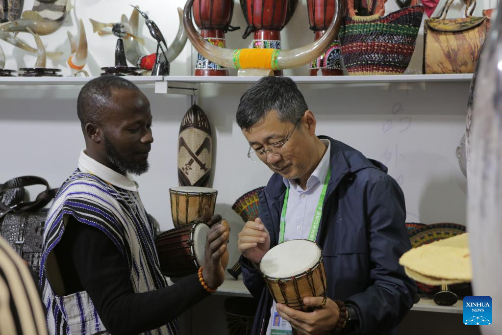 A visitor tries an African drum at a booth of Ghana during the seventh China International Import Expo (CIIE) in east China's Shanghai, Nov. 8, 2024. The current edition of CIIE has further expanded the exhibition scale for African countries and brands at the Country Exhibition area and the Food and Agricultural Products area, where a wide range of high-quality African products with distinctive features are showcased. (Xinhua/Tang Rufeng)