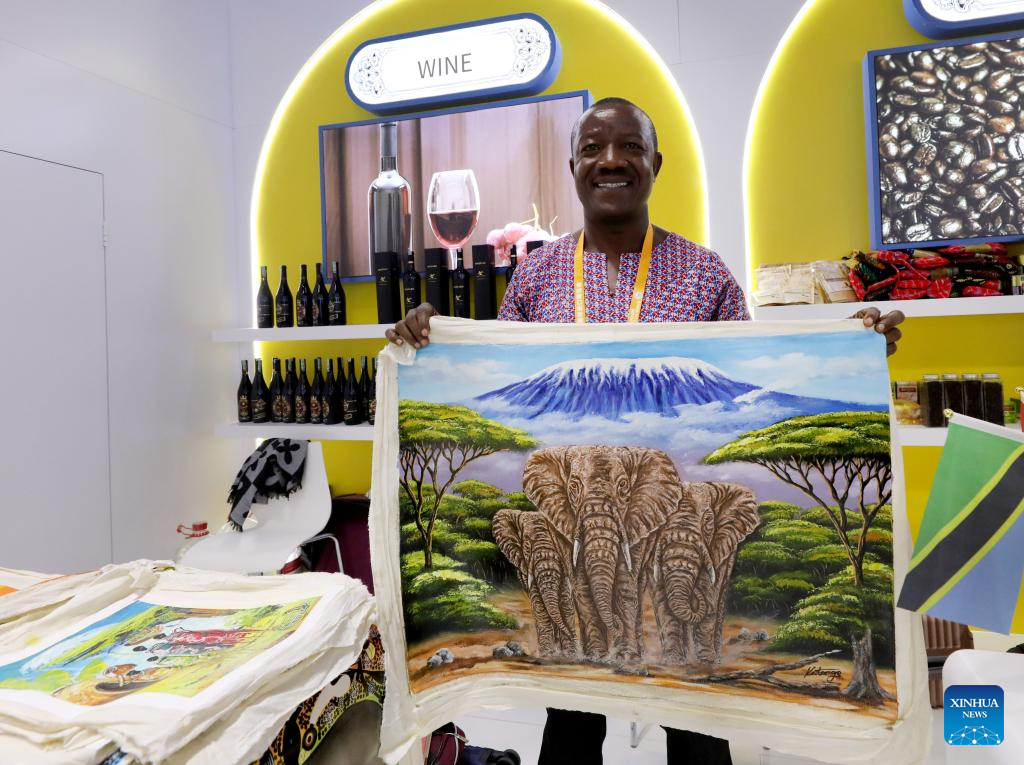 An exhibitor shows a painting at the Tanzania Pavilion during the seventh China International Import Expo (CIIE) in east China's Shanghai, Nov. 7, 2024. The current edition of CIIE has further expanded the exhibition scale for African countries and brands at the Country Exhibition area and the Food and Agricultural Products area, where a wide range of high-quality African products with distinctive features are showcased. (Xinhua/Fang Zhe)