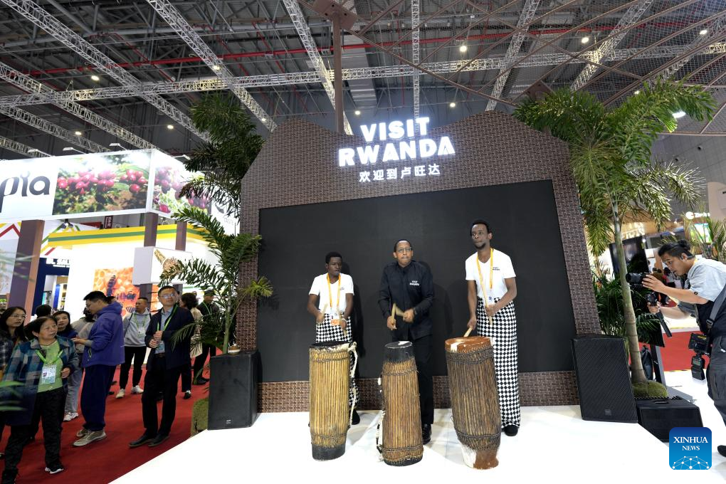 Artists stage a performance at the Rwanda Pavilion during the seventh China International Import Expo (CIIE) in east China's Shanghai, Nov. 7, 2024. The current edition of CIIE has further expanded the exhibition scale for African countries and brands at the Country Exhibition area and the Food and Agricultural Products area, where a wide range of high-quality African products with distinctive features are showcased. (Xinhua/Zhang Jiansong)