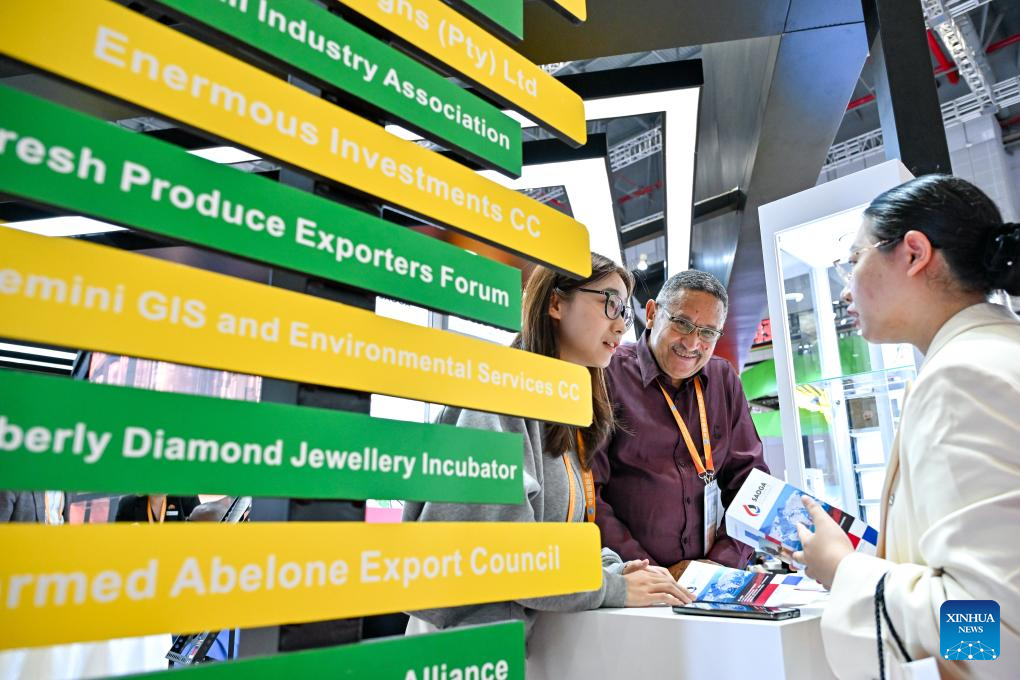 A visitor talks with exhibitors at the South Africa Pavilion during the seventh China International Import Expo (CIIE) in east China's Shanghai, Nov. 7, 2024. The current edition of CIIE has further expanded the exhibition scale for African countries and brands at the Country Exhibition area and the Food and Agricultural Products area, where a wide range of high-quality African products with distinctive features are showcased. (Xinhua/Zhang Cheng)