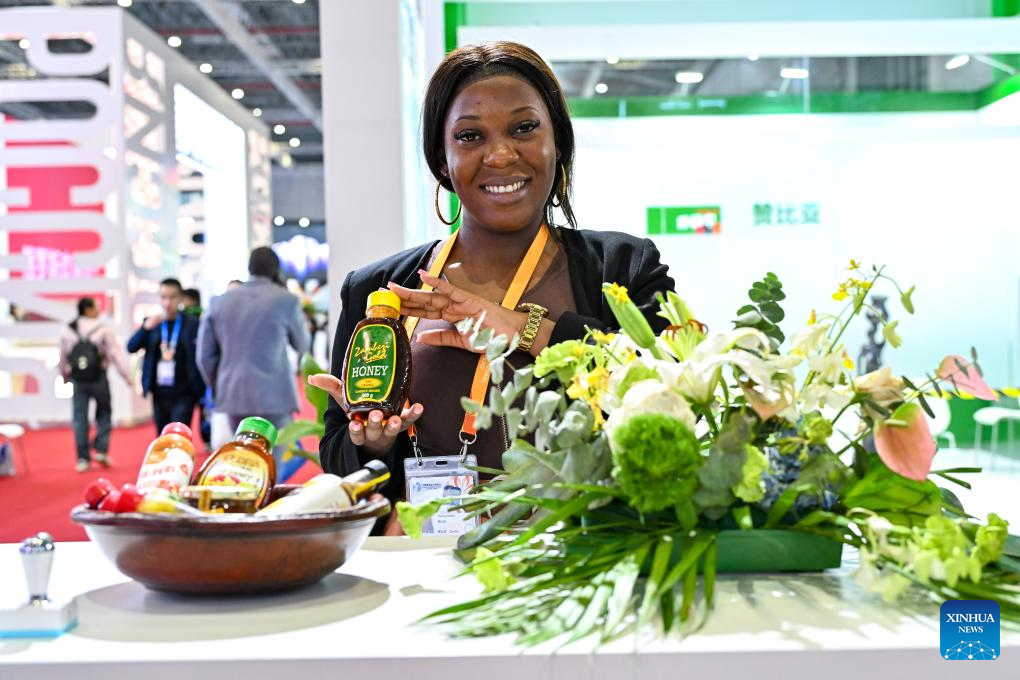 An exhibitor shows a honey product at the Zambia Pavilion during the seventh China International Import Expo (CIIE) in east China's Shanghai, Nov. 7, 2024. The current edition of CIIE has further expanded the exhibition scale for African countries and brands at the Country Exhibition area and the Food and Agricultural Products area, where a wide range of high-quality African products with distinctive features are showcased. (Xinhua/Zhang Cheng)