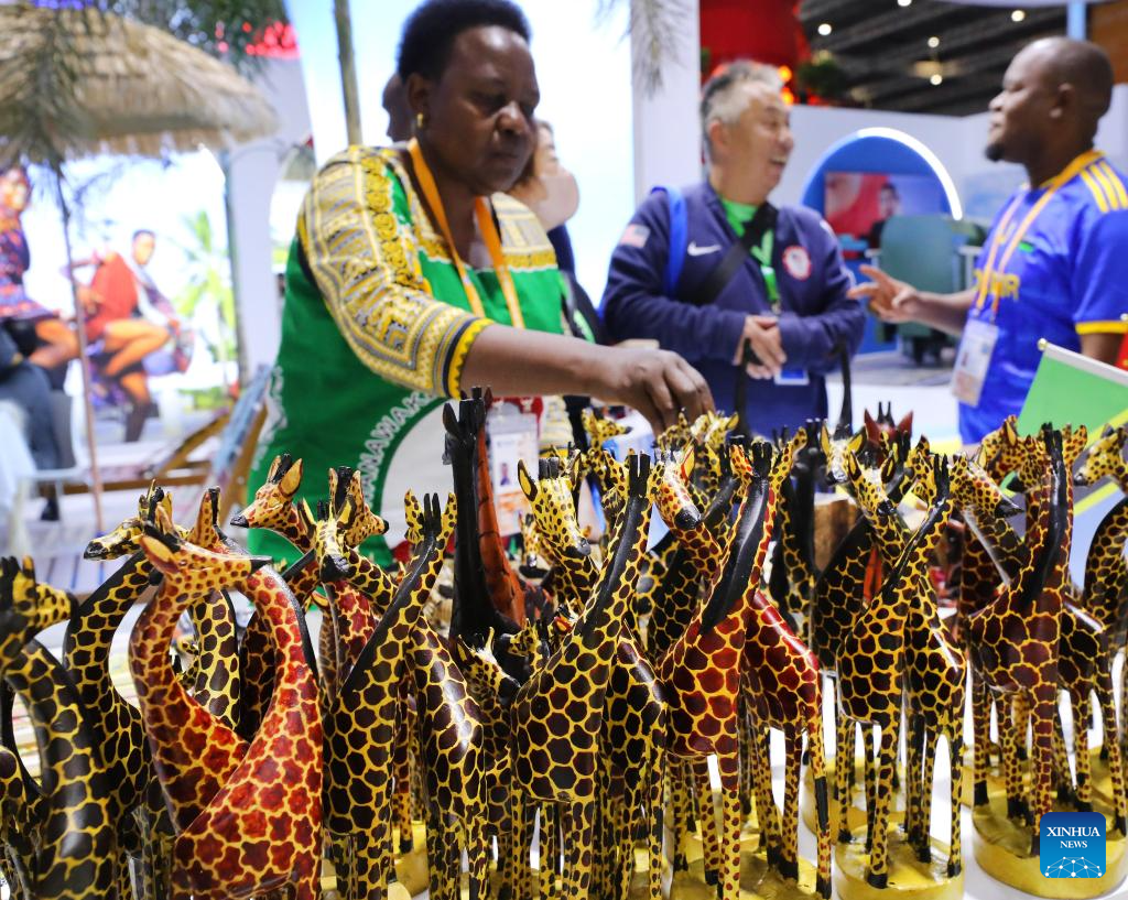An exhibitor arranges wood carvings at the Tanzania Pavilion during the seventh China International Import Expo (CIIE) in east China's Shanghai, Nov. 7, 2024. The current edition of CIIE has further expanded the exhibition scale for African countries and brands at the Country Exhibition area and the Food and Agricultural Products area, where a wide range of high-quality African products with distinctive features are showcased. (Xinhua/Fang Zhe)