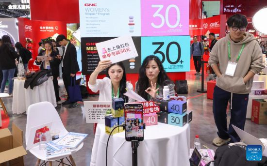 Staff members promote products via livestream at the Medical Equipment &Healthcare Products Exhibition Area during the 7th China International Import Expo (CIIE) in east China's Shanghai, Nov. 8, 2024. With the theme of "Healthy China, Better Life," the Medical Equipment &Healthcare Products Exhibition Area during the 7th CIIE presented international leading medical innovation products and cutting-edge technologies and services. (Xinhua/Yin Gang)