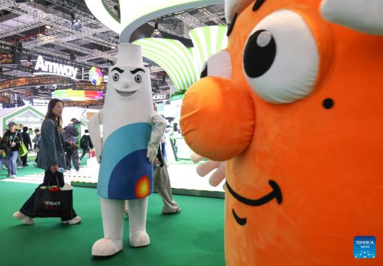 Staff members in puppet costumes welcome visitors at the Medical Equipment &Healthcare Products Exhibition Area during the 7th China International Import Expo (CIIE) in east China's Shanghai, Nov. 8, 2024. With the theme of "Healthy China, Better Life," the Medical Equipment &Healthcare Products Exhibition Area during the 7th CIIE presented international leading medical innovation products and cutting-edge technologies and services. (Xinhua/Yin Gang)