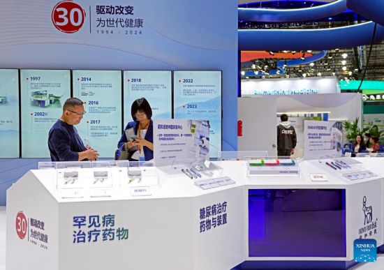 People visit the booth of Roche at the Medical Equipment &Healthcare Products Exhibition Area during the 7th China International Import Expo (CIIE) in east China's Shanghai, Nov. 8, 2024. With the theme of "Healthy China, Better Life," the Medical Equipment &Healthcare Products Exhibition Area during the 7th CIIE presented international leading medical innovation products and cutting-edge technologies and services. (Xinhua/Xin Yuewei)