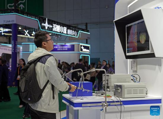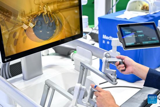 A visitor tries a surgery robot at the booth of Medtronic at the Medical Equipment &Healthcare Products Exhibition Area during the 7th China International Import Expo (CIIE) in east China's Shanghai, Nov. 5, 2024. With the theme of "Healthy China, Better Life," the Medical Equipment &Healthcare Products Exhibition Area during the 7th CIIE presented international leading medical innovation products and cutting-edge technologies and services. (Xinhua/Zhang Cheng)