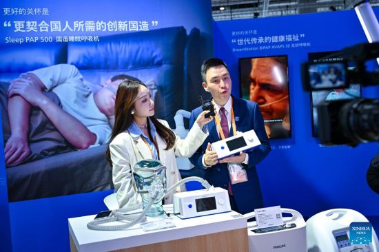 An exhibitor (R) introduces an oxygen concentrator at the booth of Philips at the Medical Equipment &Healthcare Products Exhibition Area during the 7th China International Import Expo (CIIE) in east China's Shanghai, Nov. 8, 2024. With the theme of "Healthy China, Better Life," the Medical Equipment &Healthcare Products Exhibition Area during the 7th CIIE presented international leading medical innovation products and cutting-edge technologies and services. (Xinhua/Zhang Cheng)