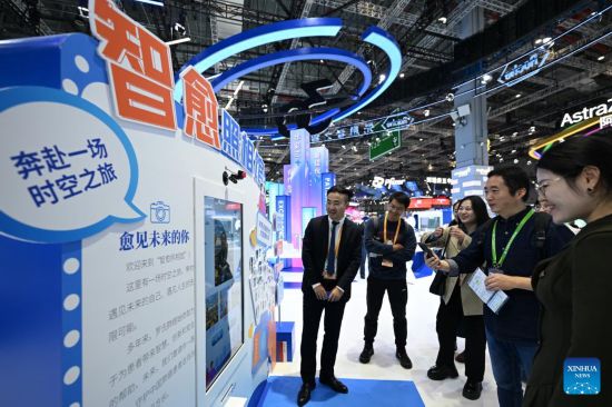 Visitors learn about medical treatment at the Medical Equipment &Healthcare Products Exhibition Area during the 7th China International Import Expo (CIIE) in east China's Shanghai, Nov. 8, 2024. With the theme of "Healthy China, Better Life," the Medical Equipment &Healthcare Products Exhibition Area during the 7th CIIE presented international leading medical innovation products and cutting-edge technologies and services. (Xinhua/Xin Yuewei)