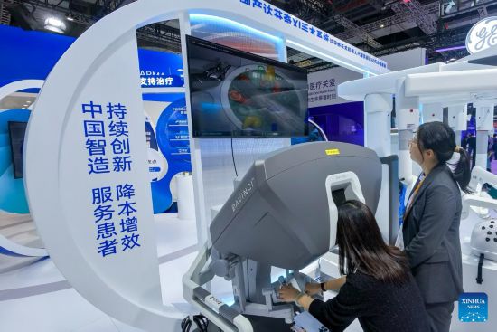 A visitor tries a surgery robot at the booth of Fosunpharma at the Medical Equipment &Healthcare Products Exhibition Area during the 7th China International Import Expo (CIIE) in east China's Shanghai, Nov. 8, 2024. With the theme of "Healthy China, Better Life," the Medical Equipment &Healthcare Products Exhibition Area during the 7th CIIE presented international leading medical innovation products and cutting-edge technologies and services. (Xinhua/Zhang Cheng)