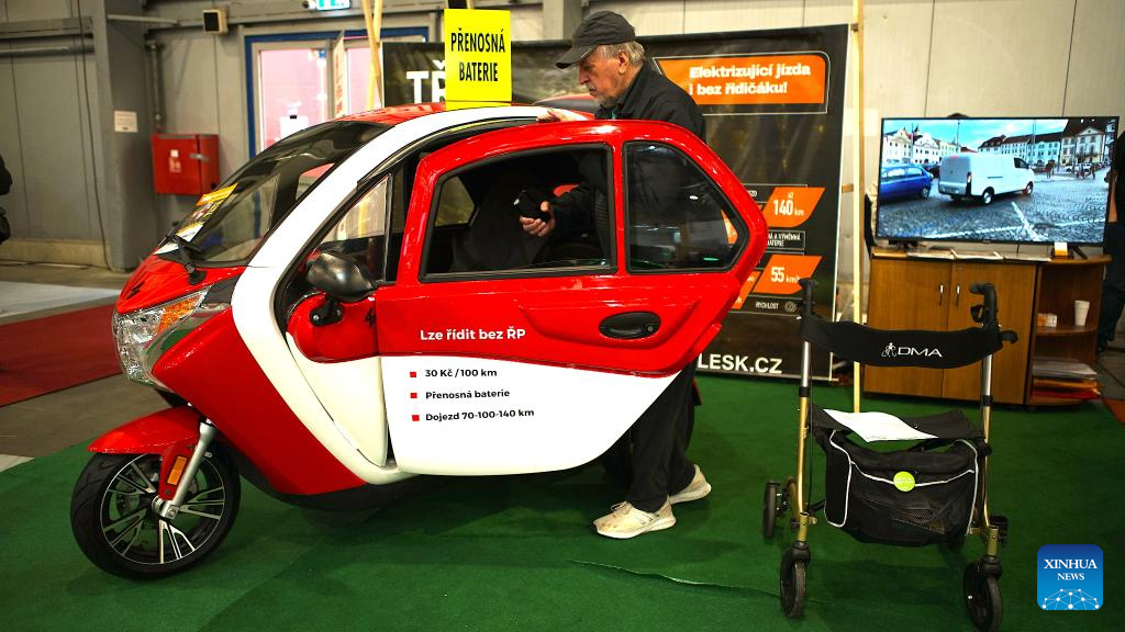 A man tries an electric tricycle at the e-SALON in Prague, the Czech Republic, on Nov. 8, 2024. The 6th edition of the e-SALON, a trade fair of clean mobility, technologies and e-mobility solutions, is held here from Nov. 7 to Nov. 10. (Photo by Dana Kesnerova/Xinhua)