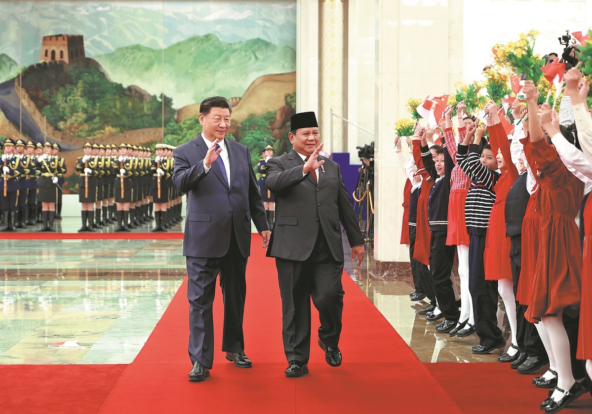 President Xi Jinping and visiting Indonesian President Prabowo Subianto attend a welcoming ceremony before holding talks at the Great Hall of the People in Beijing on Saturday. (FENG YONGBIN/CHINA DAILY)