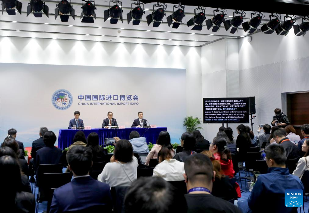 A news briefing for the closing of the 7th China International Import Expo (CIIE) is held at the National Exhibition and Convention Center (Shanghai) in east China's Shanghai on Nov. 10, 2024. (Xinhua/Fang Zhe)