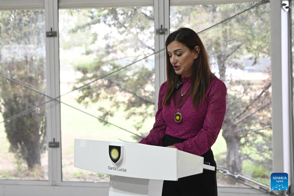 Santa Lucija Mayor Charmaine St. John speaks at the launch of the "Nihao! China" initiative for Chinese cultural and tourism promotion in Santa Lucija, Malta, on Nov. 9, 2024. Three Chinese-made electric buses, each adorned with vibrant images of iconic Chinese landscapes and cultural heritage sites, began operating across Malta on Saturday. (Photo by Jonathan Borg/Xinhua)