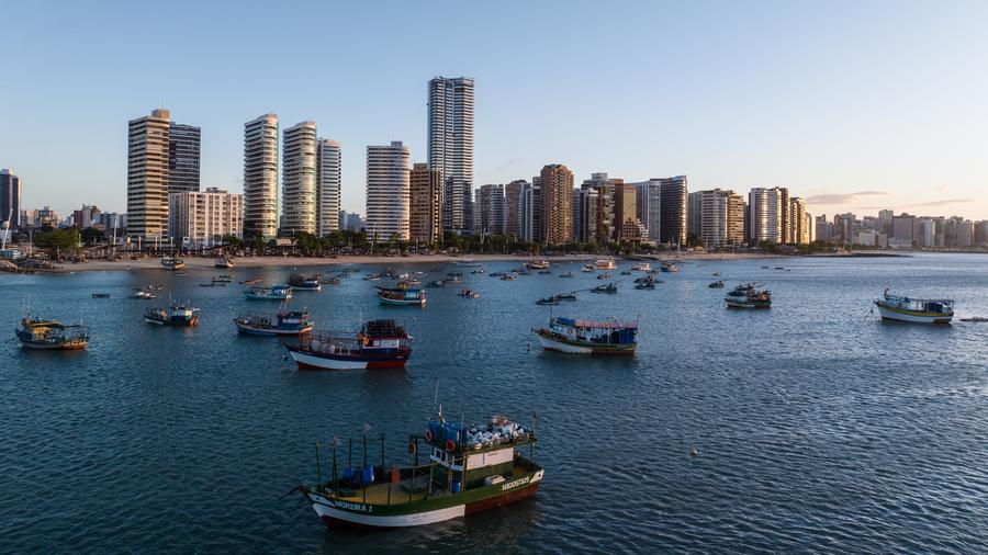 This aerial photo taken on Aug. 8, 2023 shows fishing boats and buildings in Fortaleza, Brazil. (Xinhua/Wang Tiancong)