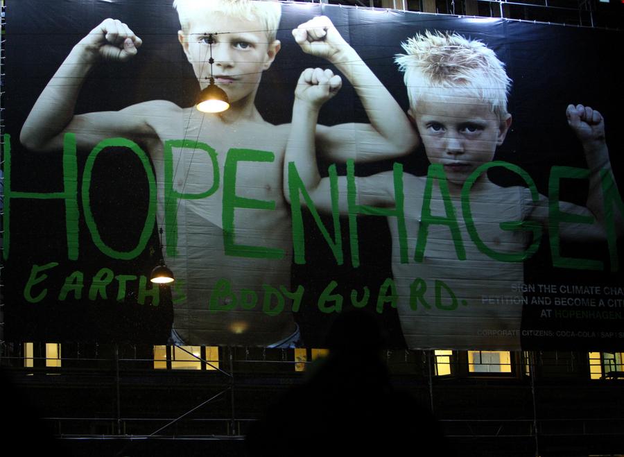 A huge poster promoting the UN Climate Conference is seen at the street in Copenhagen, capital of Denmark, December 19, 2009. (Xinhua/Xie Xiudong)