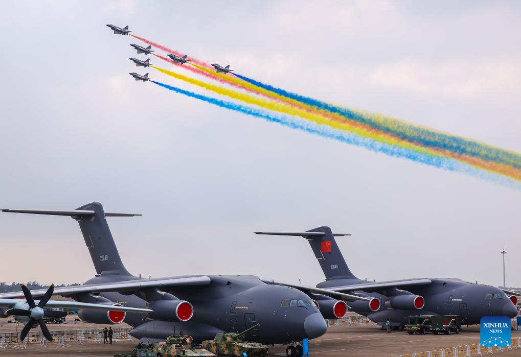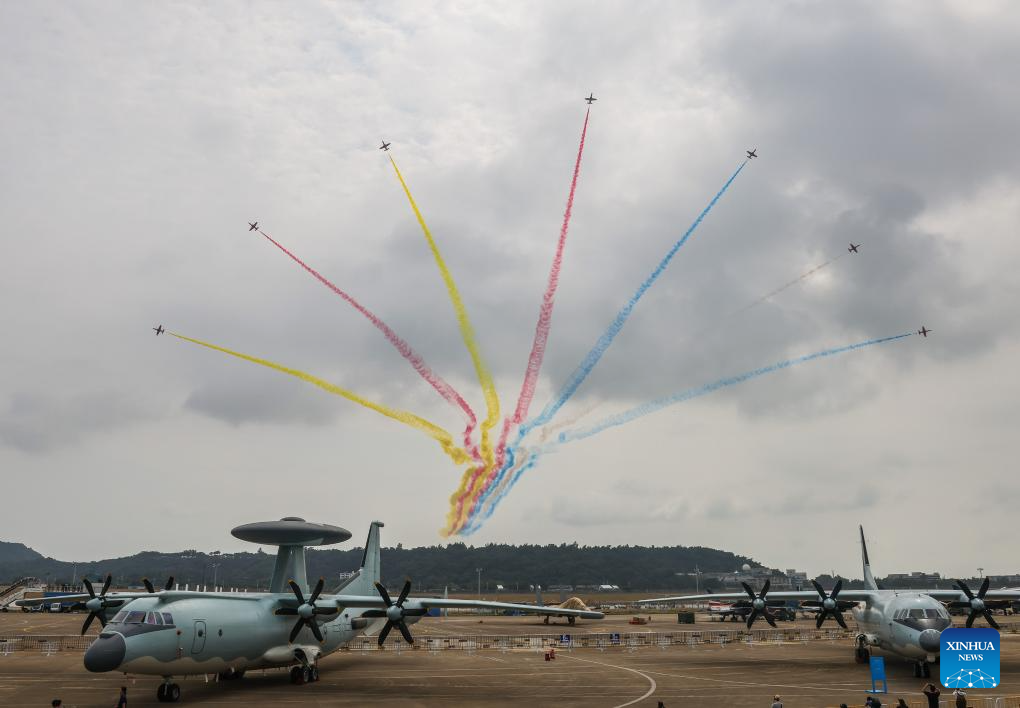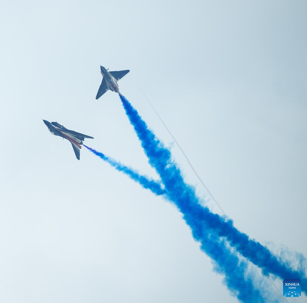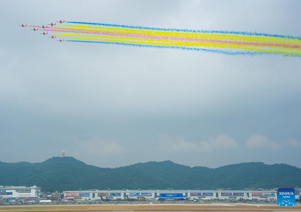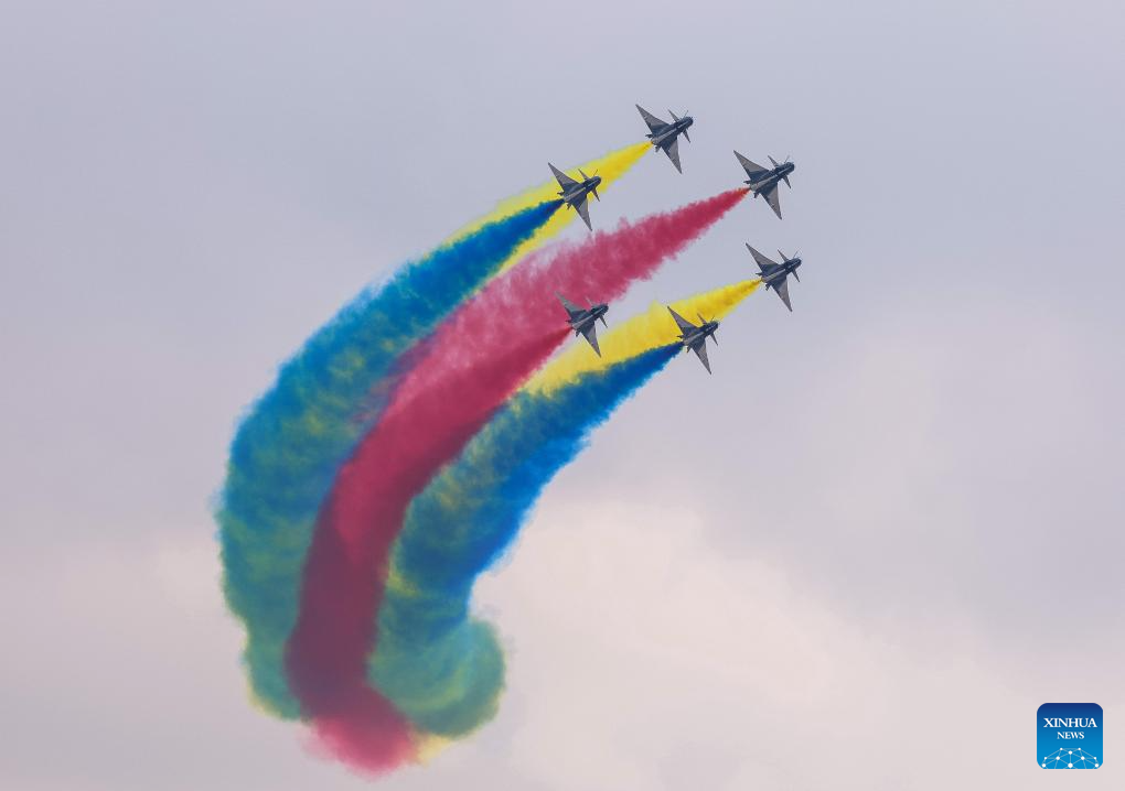 Aircraft of the Bayi Aerobatic Team of the Chinese People's Liberation Army Air Force conduct adaptive training for the upcoming Airshow China in Zhuhai, south China's Guangdong Province, Nov. 11, 2024. The 15th China International Aviation and Aerospace Exhibition, also known as Airshow China, will be held in Zhuhai from Nov. 12 to 17. (Photo by Yang Bo/Xinhua)