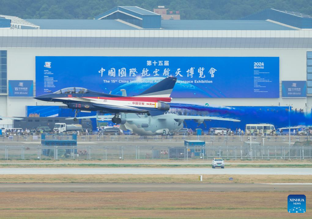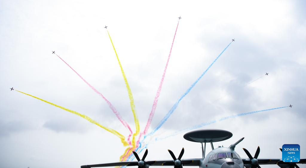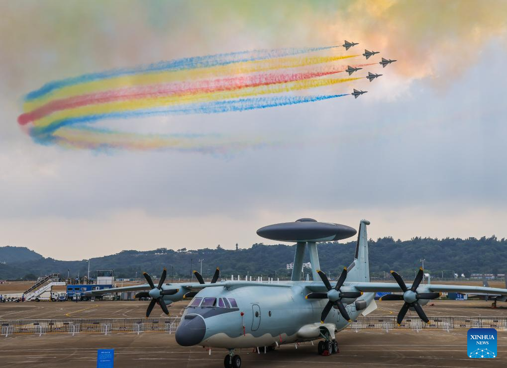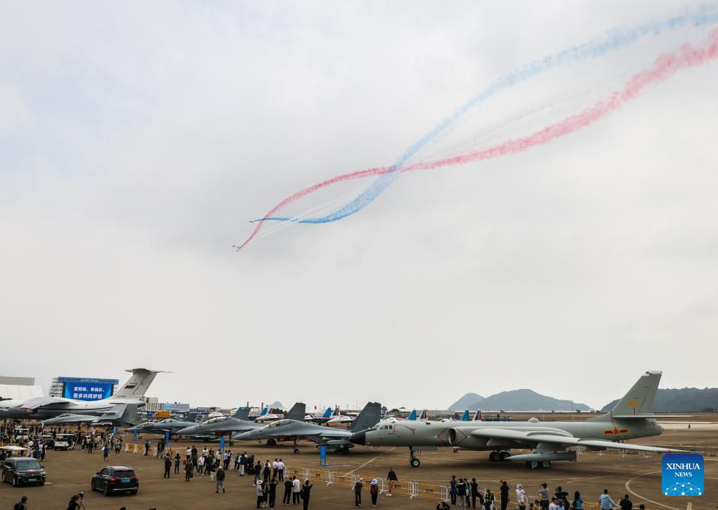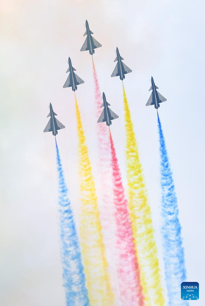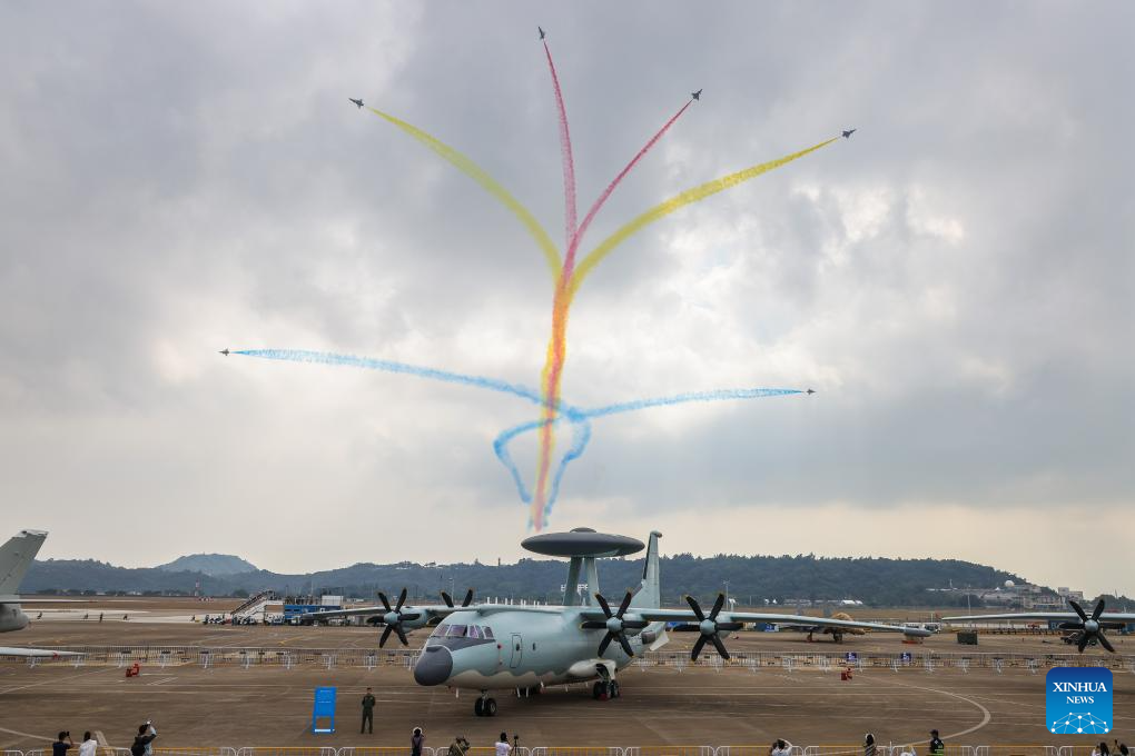 Aircraft of the Bayi Aerobatic Team of the Chinese People's Liberation Army Air Force conduct adaptive training for the upcoming Airshow China in Zhuhai, south China's Guangdong Province, Nov. 11, 2024. The 15th China International Aviation and Aerospace Exhibition, also known as Airshow China, will be held in Zhuhai from Nov. 12 to 17. (Photo by Yang Bo/Xinhua)