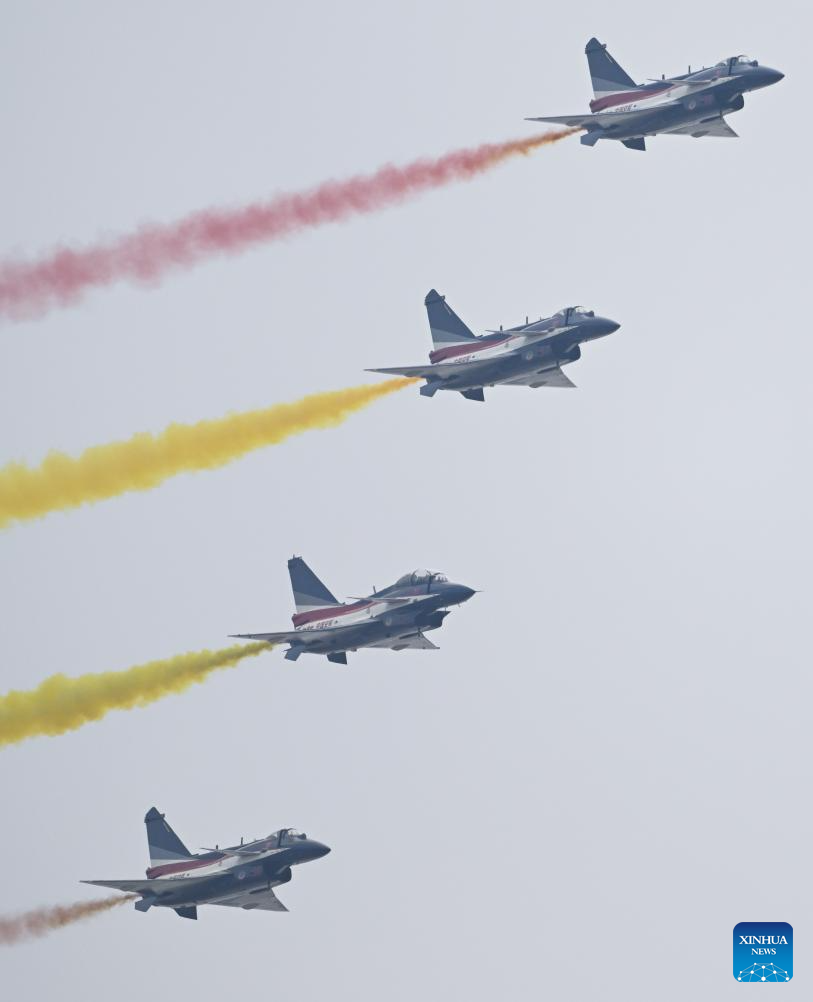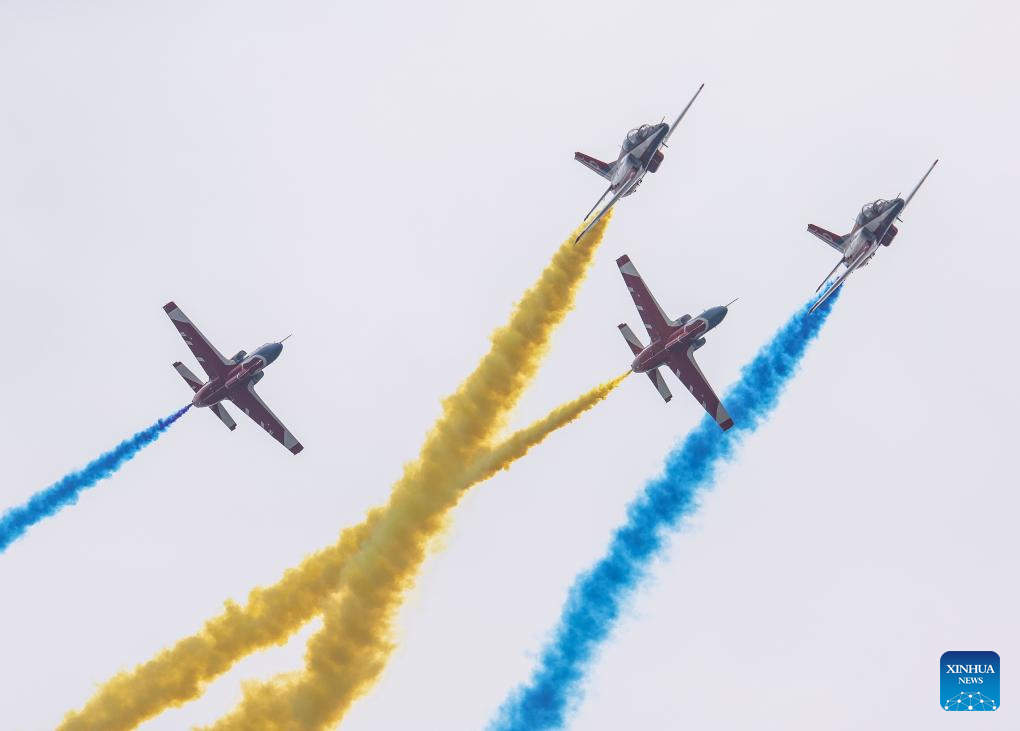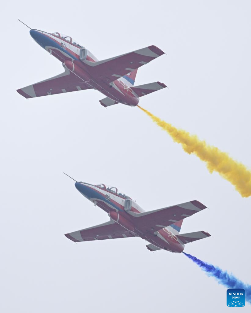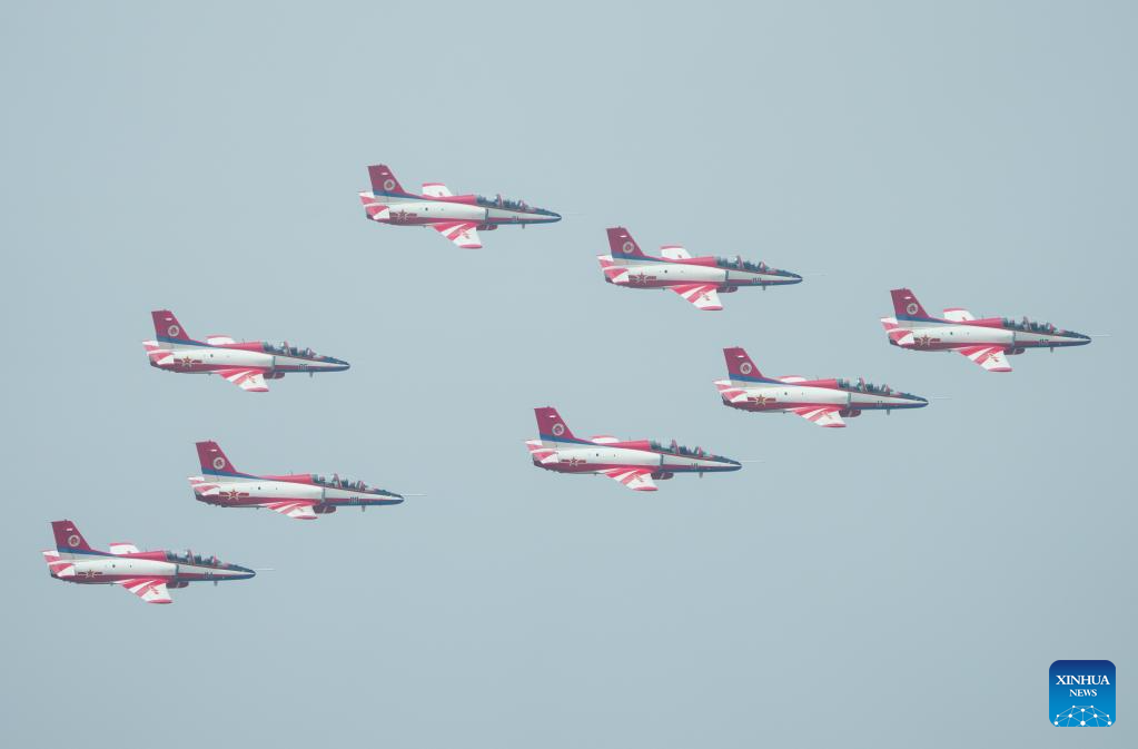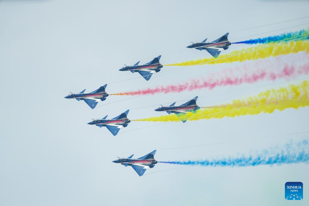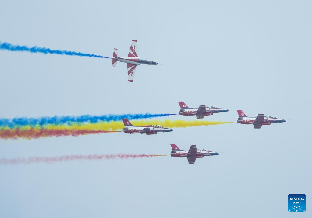 Aircraft of the Bayi Aerobatic Team of the Chinese People's Liberation Army Air Force conduct adaptive training for the upcoming Airshow China in Zhuhai, south China's Guangdong Province, Nov. 11, 2024. The 15th China International Aviation and Aerospace Exhibition, also known as Airshow China, will be held in Zhuhai from Nov. 12 to 17. (Xinhua/Liu Dawei)