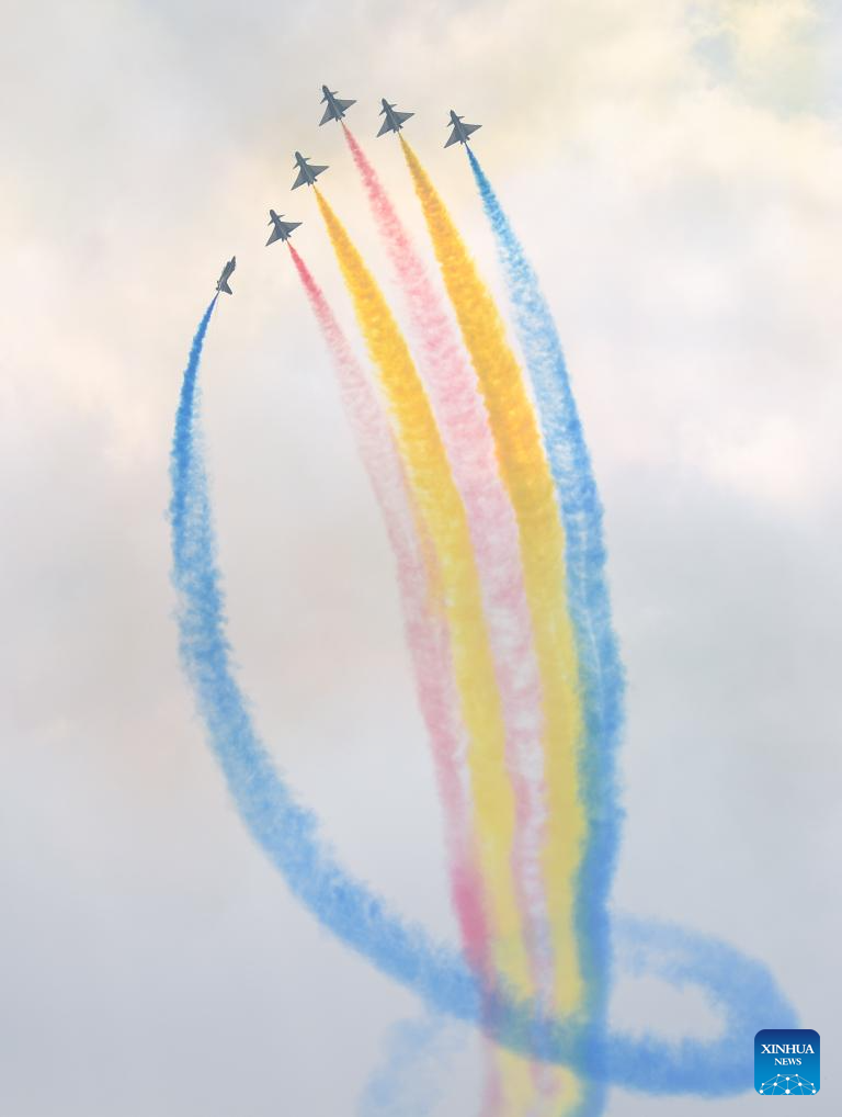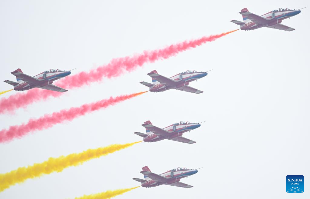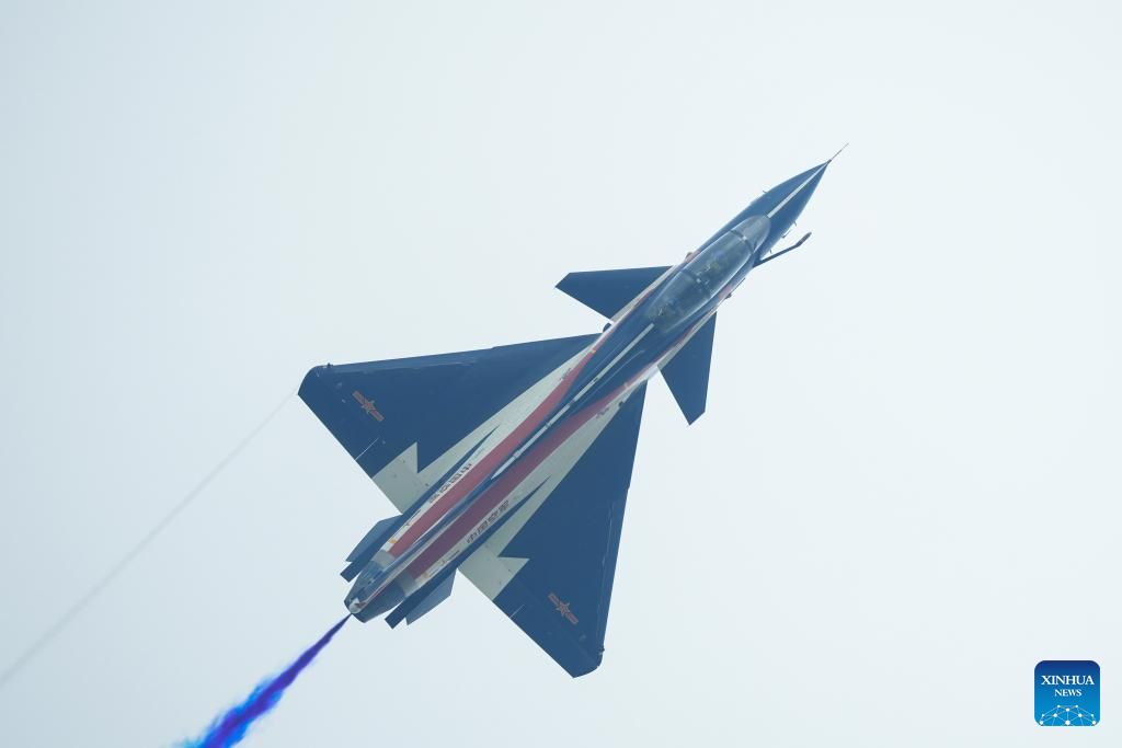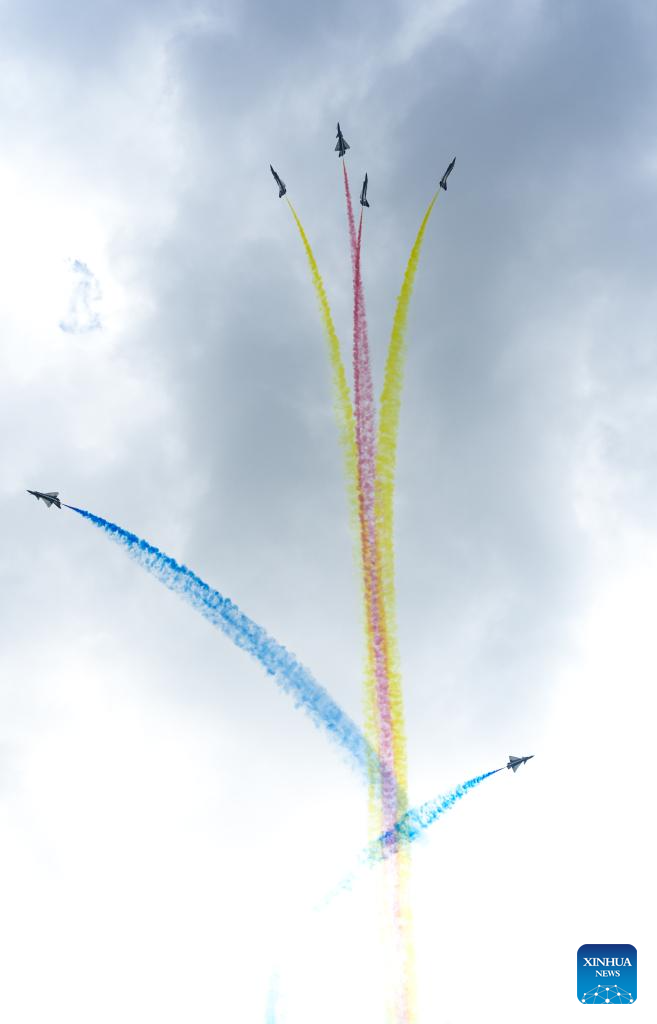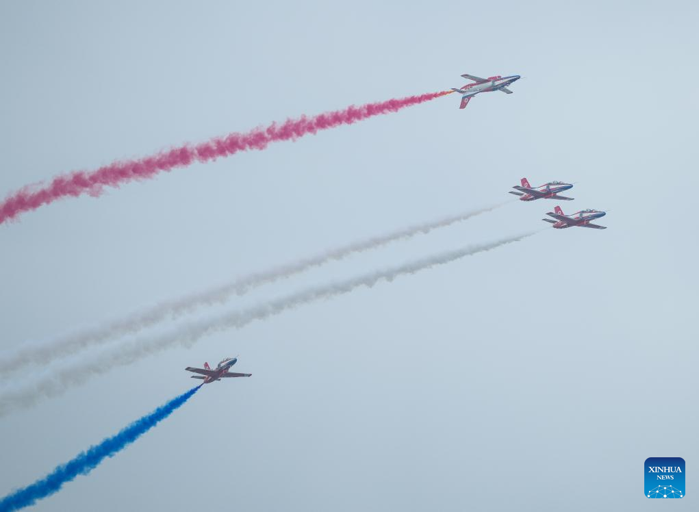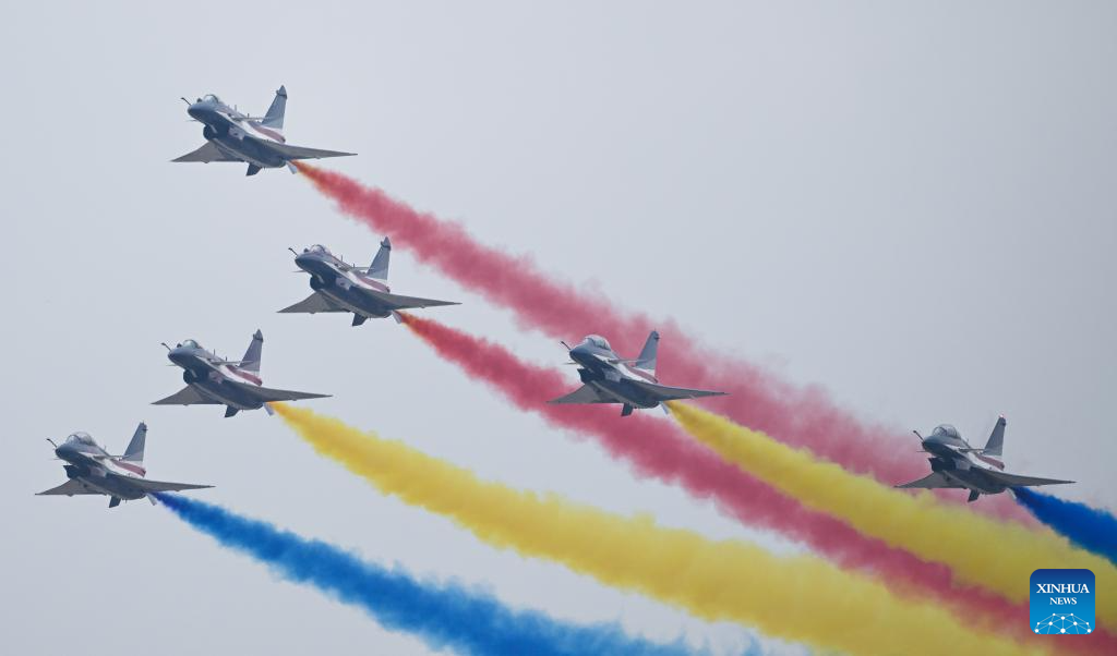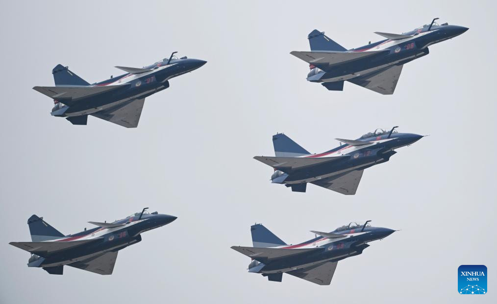 Aircraft of the Bayi Aerobatic Team of the Chinese People's Liberation Army Air Force conduct adaptive training for the upcoming Airshow China in Zhuhai, south China's Guangdong Province, Nov. 11, 2024. The 15th China International Aviation and Aerospace Exhibition, also known as Airshow China, will be held in Zhuhai from Nov. 12 to 17. (Xinhua/Liu Dawei)