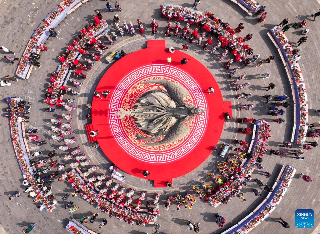 An aerial drone photo taken on Nov. 11, 2024 shows a scene during a mass wedding ceremony in Fenghuang ancient town in Xiangxi Tujia and Miao Autonomous Prefecture, central China's Hunan Province. A hundred couples from all over China attended a mass wedding ceremony at Fenghuang ancient town on Monday. (Photo by Guo Liliang/Xinhua)