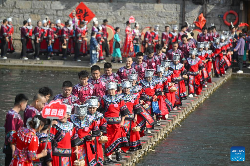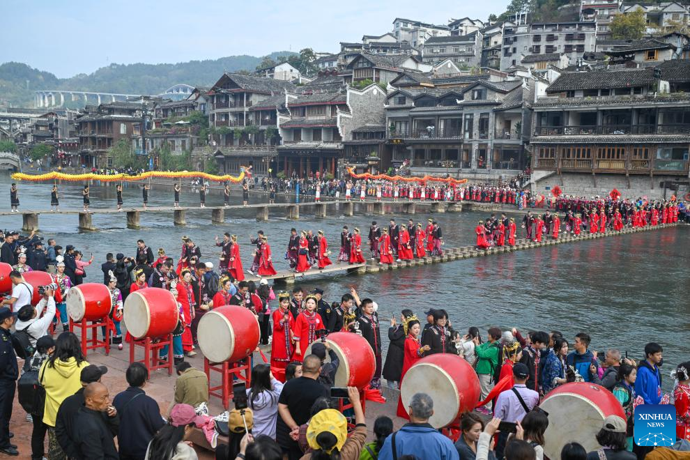 The newlyweds dressed in wedding costumes parade in Fenghuang ancient town in Xiangxi Tujia and Miao Autonomous Prefecture, central China's Hunan Province, Nov. 11, 2024. A hundred couples from all over China attended a mass wedding ceremony at Fenghuang ancient town on Monday. (Photo by Guo Liliang/Xinhua)