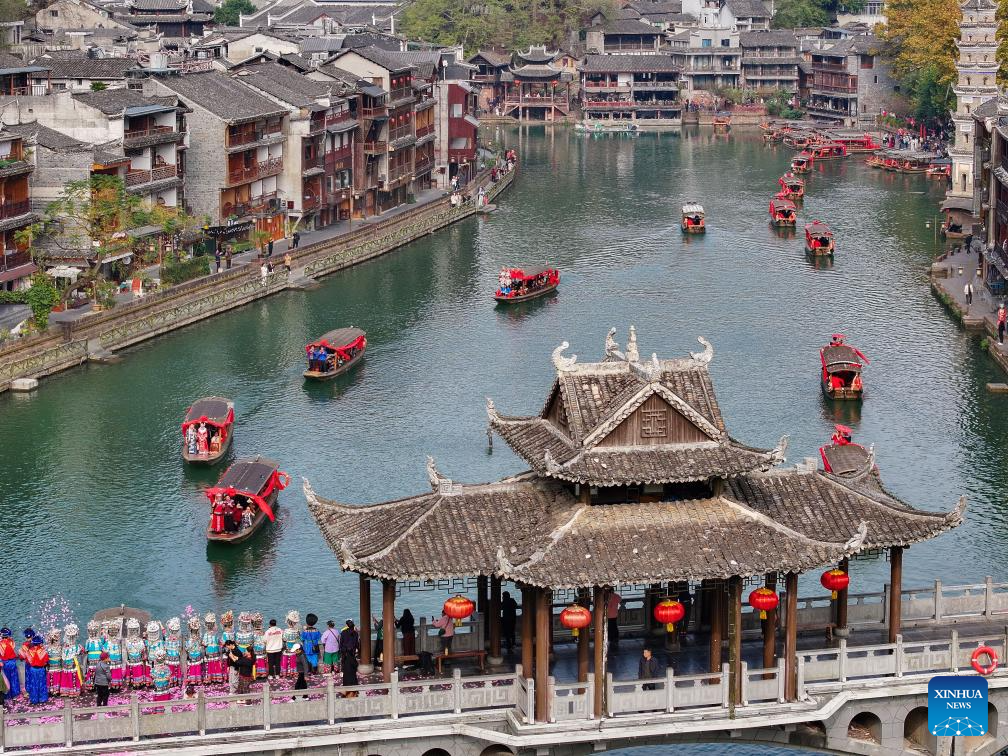 An aerial drone photo taken on Nov. 11, 2024 shows the newlyweds taking boats to parade in Fenghuang ancient town in Xiangxi Tujia and Miao Autonomous Prefecture, central China's Hunan Province. A hundred couples from all over China attended a mass wedding ceremony at Fenghuang ancient town on Monday. (Photo by Guo Liliang/Xinhua)