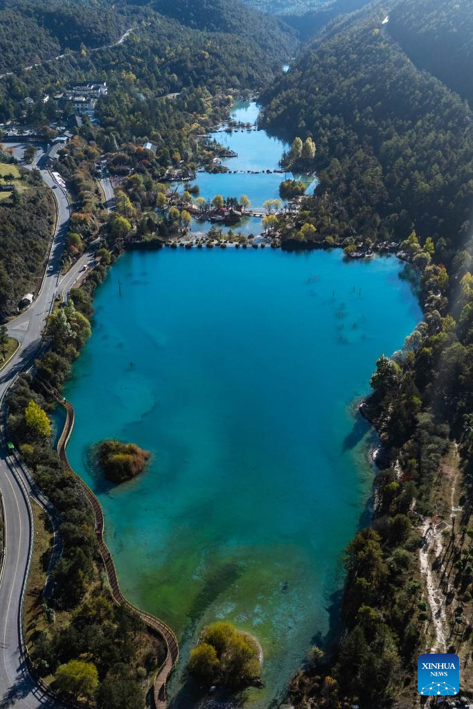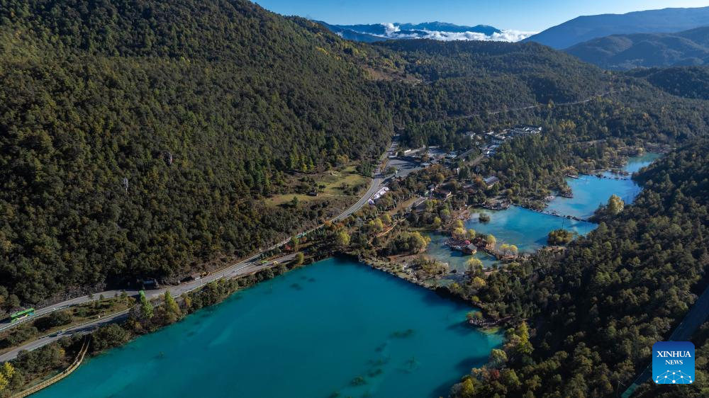 An aerial drone photo taken on Nov. 9, 2024 shows the scenery of Lanyue (Blue Moon) Valley in Lijiang, southwest China's Yunnan Province. With the goal to build a world famous tourism city, Lijiang has been improving the service in its scenic spots such as Lijiang ancient town and Yulong Snow Mountain, in an effort to promote the high-quality development of its cultural tourism market.