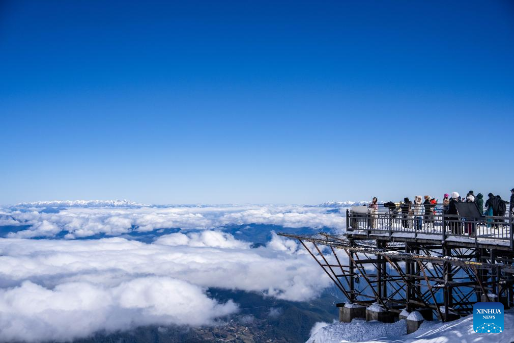Tourists view the sea of clouds on Yulong Snow Mountain in Lijiang, southwest China's Yunnan Province, Nov. 9, 2024. With the goal to build a world famous tourism city, Lijiang has been improving the service in its scenic spots such as Lijiang ancient town and Yulong Snow Mountain, in an effort to promote the high-quality development of its cultural tourism market.