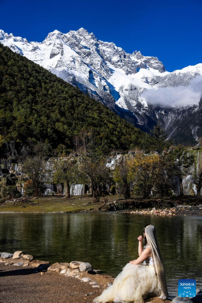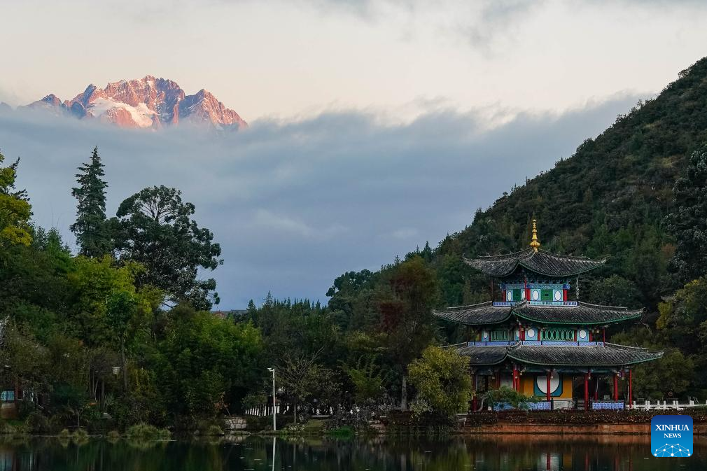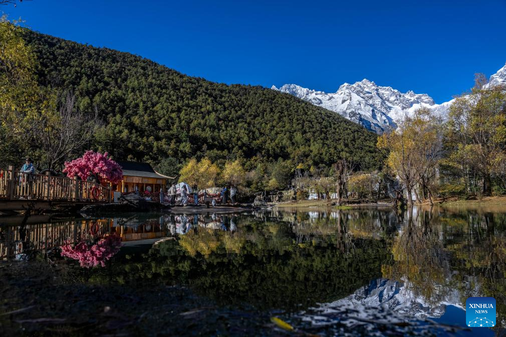 This photo taken from Heilongtan Park shows a view of the Yulong Snow Mountain in Lijiang, southwest China's Yunnan Province, Nov. 11, 2024. With the goal to build a world famous tourism city, Lijiang has been improving the service in its scenic spots such as Lijiang ancient town and Yulong Snow Mountain, in an effort to promote the high-quality development of its cultural tourism market.