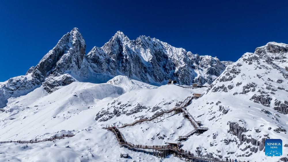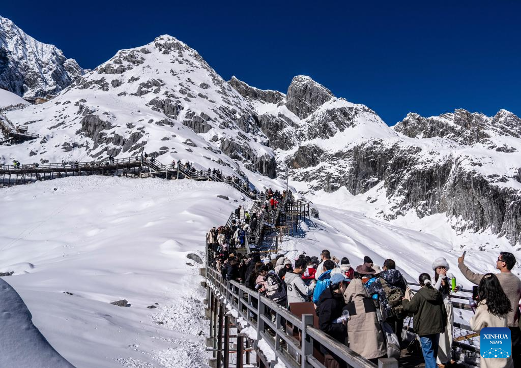 Tourists visit Yulong Snow Mountain in Lijiang, southwest China's Yunnan Province, Nov. 9, 2024. With the goal to build a world famous tourism city, Lijiang has been improving the service in its scenic spots such as Lijiang ancient town and Yulong Snow Mountain, in an effort to promote the high-quality development of its cultural tourism market.